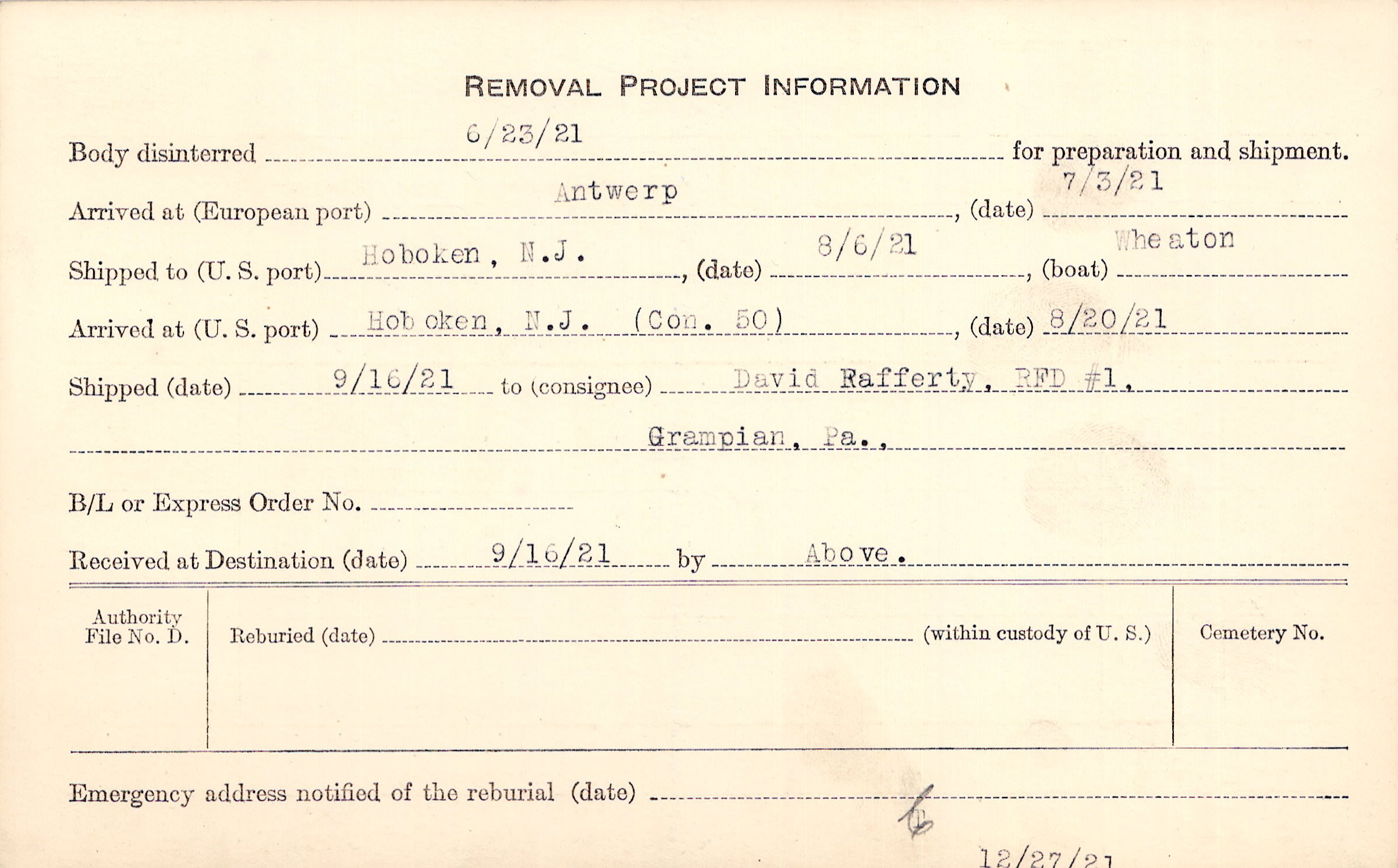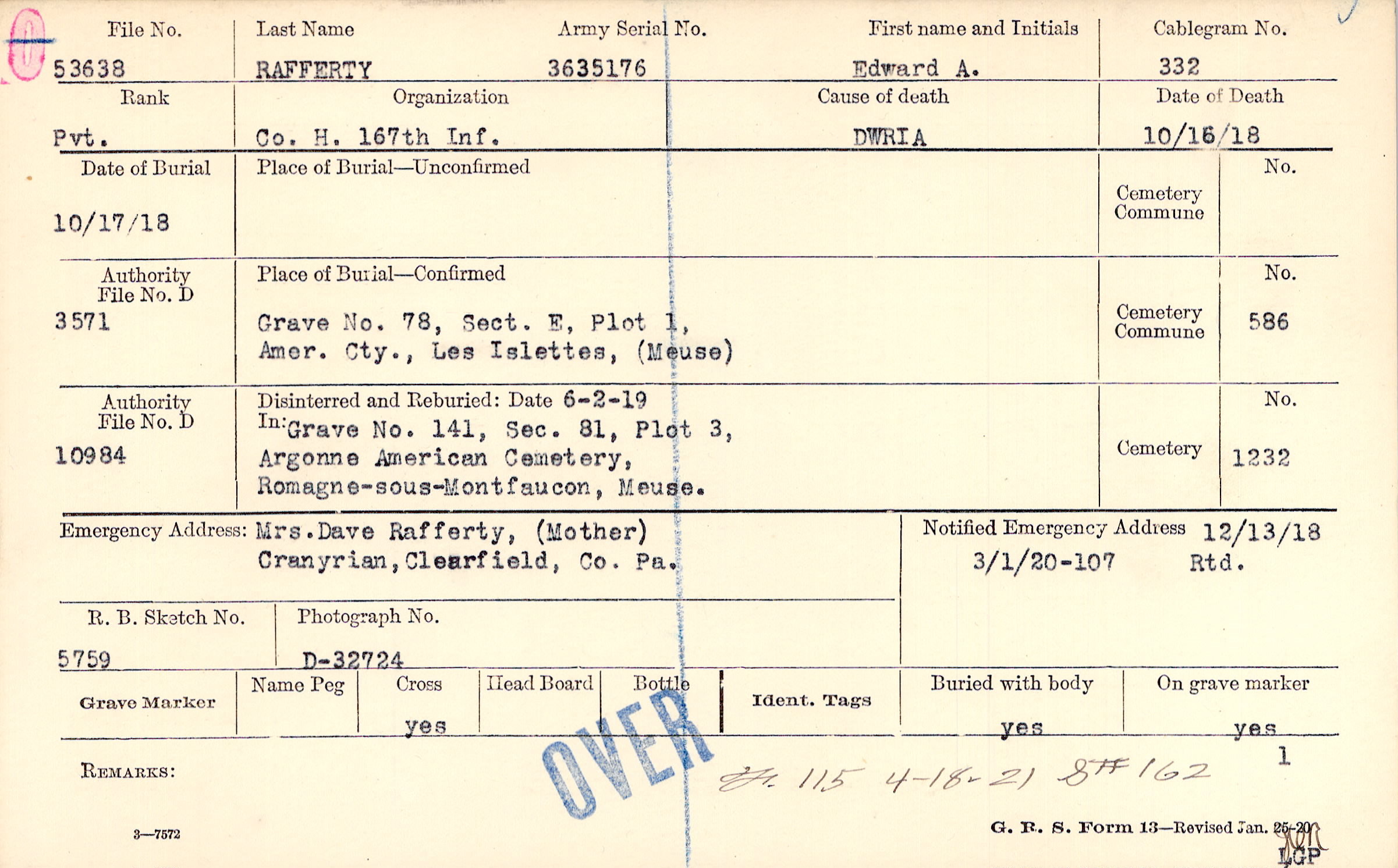 Mrs. Dave Rafferty, (Mother), Cranyrian, Clearfield, Co. Pa.