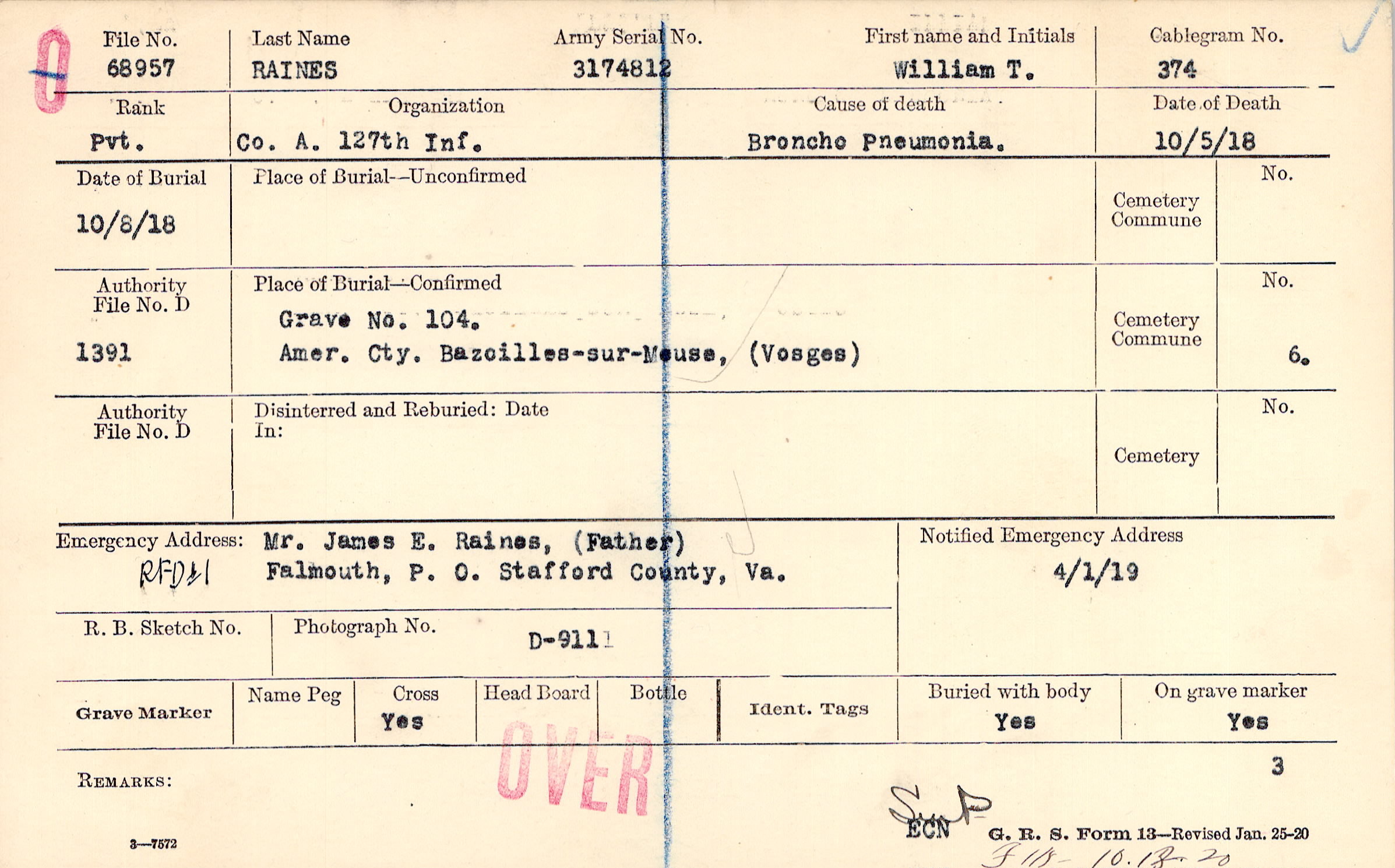 Mr. James E. Raines, (Father), RFD#1 Falmouth, P. O. Stafford County, Va., RFD #1