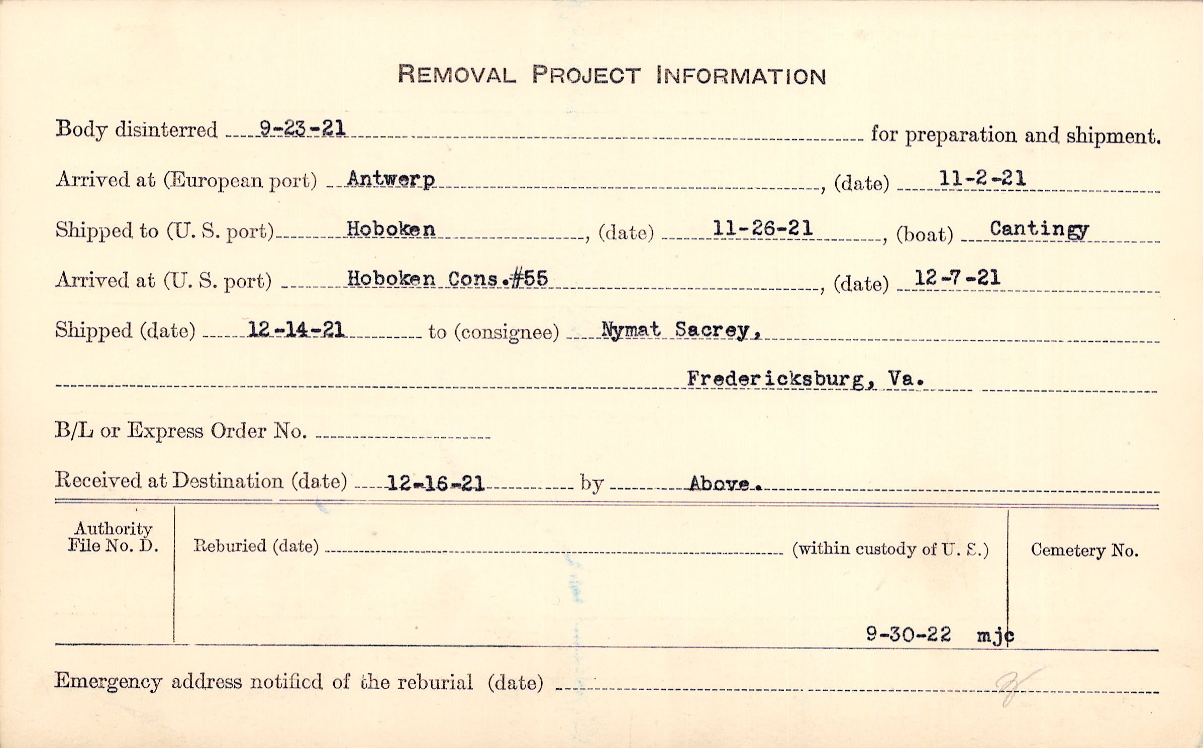 Body disinterred 9/23/1921 for preparation and shipment.