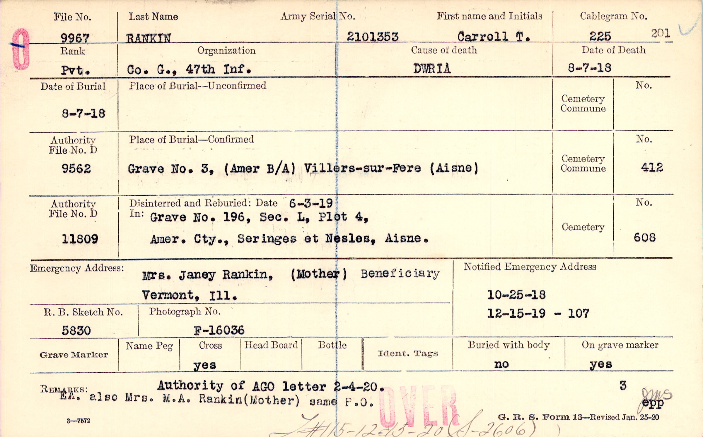 Authority of AGO letter 2-4-20 EA. also Mrs. M. A. Rankin (Mother) same P. O., F#115-12-15-20 (S-2606)