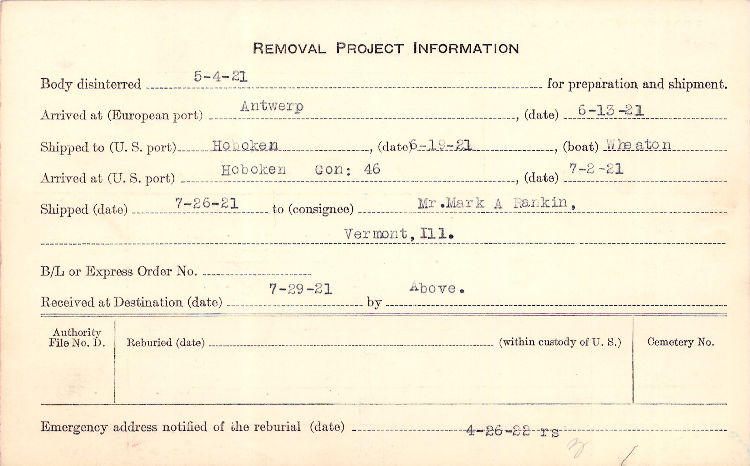 Body disinterred 5/4/1921 for preparation and shipment.