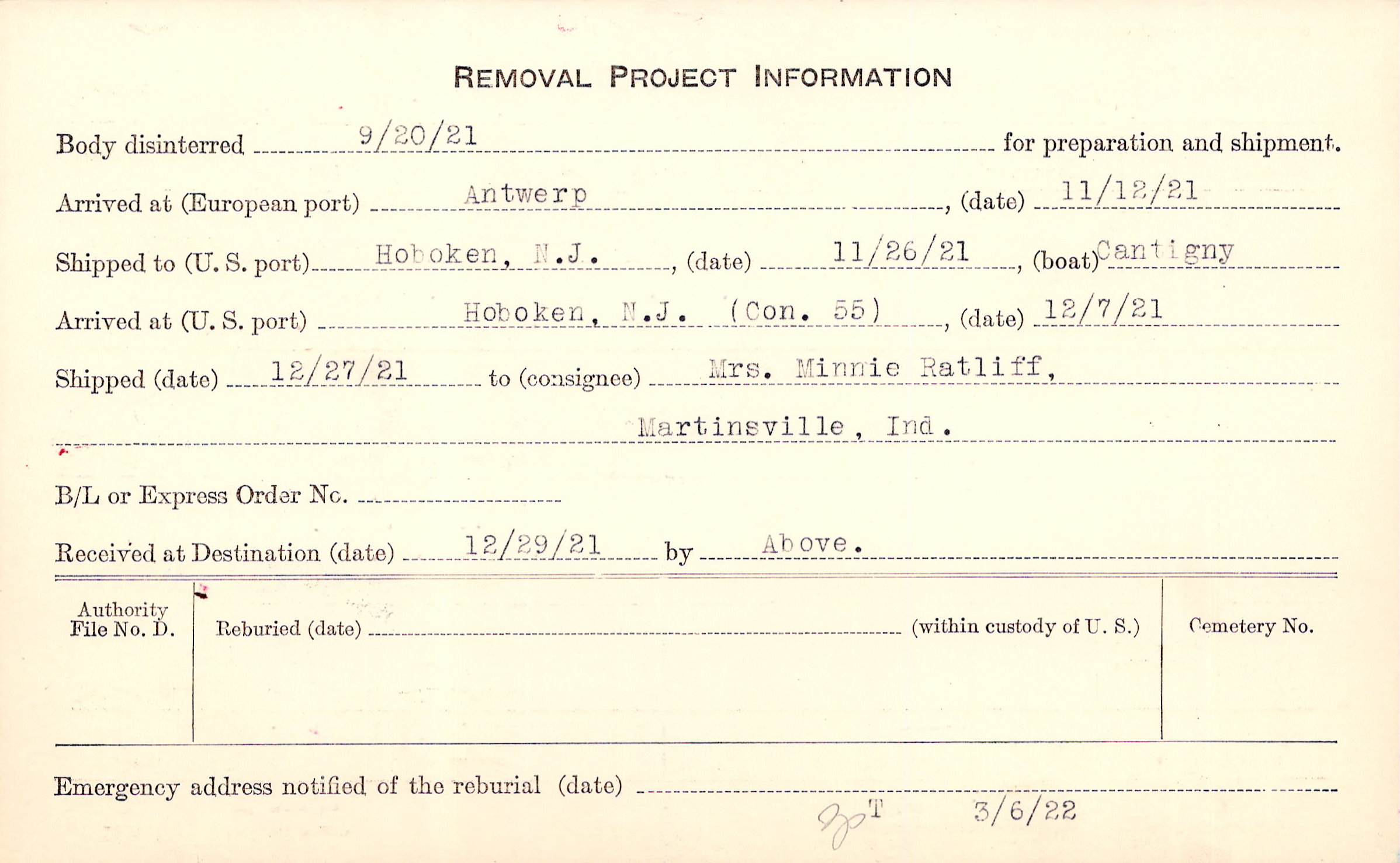 Body disinterred 9/20/1921 for preparation and shipment.