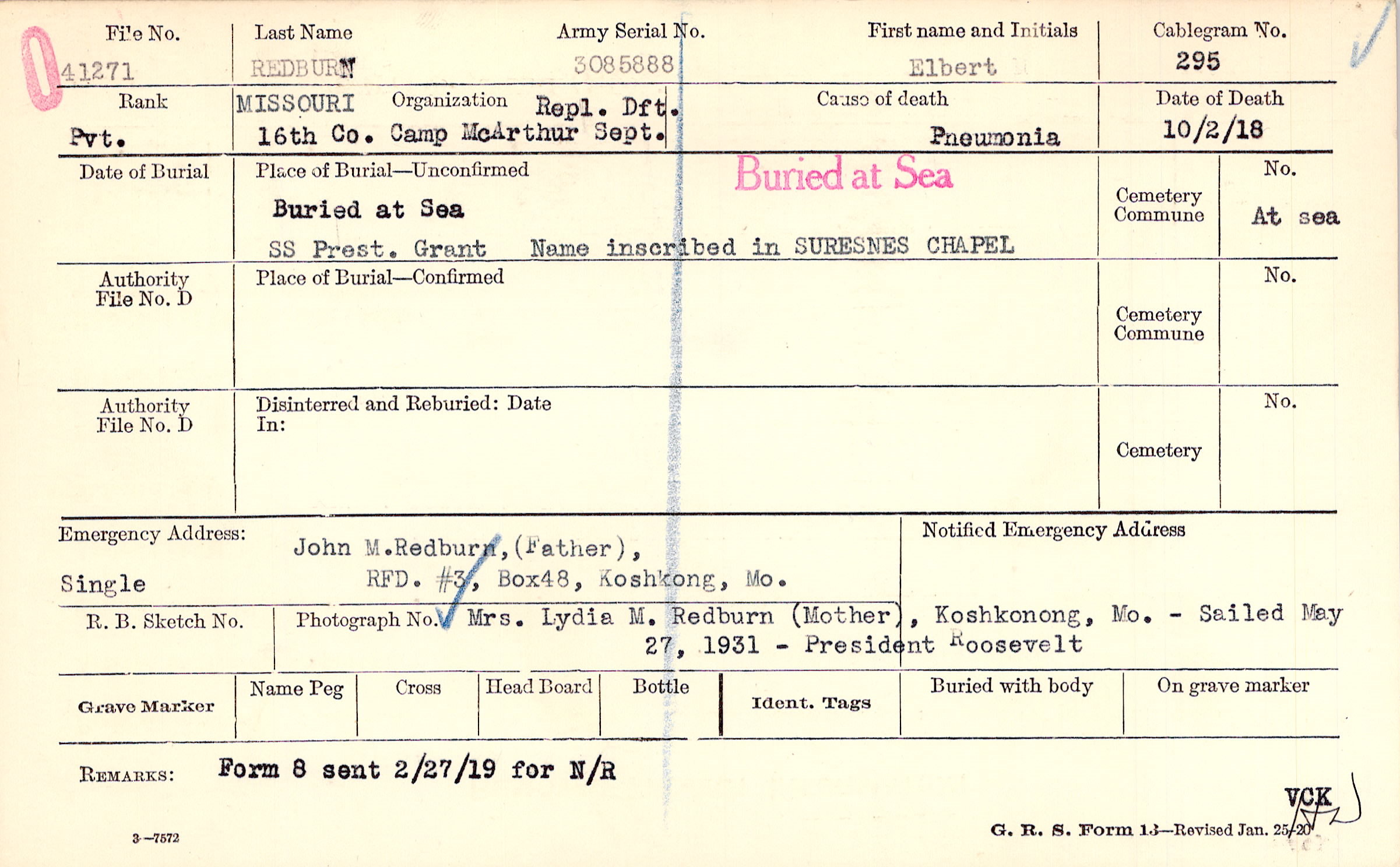 John M. Redburn, (Father), RFD #3, Box 48, Koshkong, Mo., Single Mrs. Lydia M. Redburn (Mother), Koshkonong, Mo. - Sailed May 27, 1931 - President Roosevelt