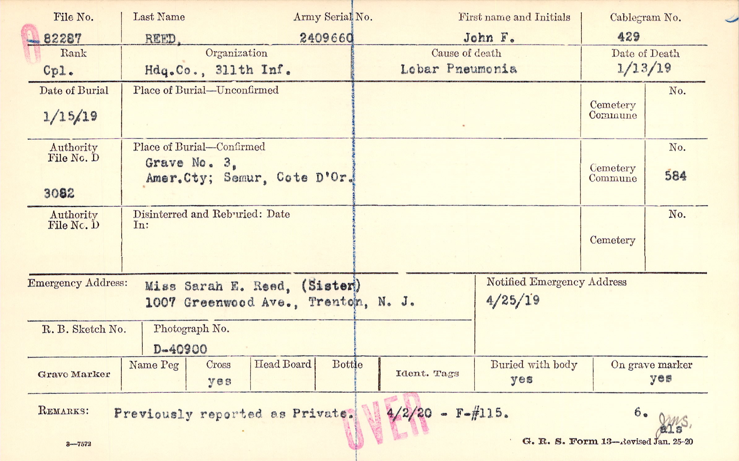 Miss Sarah E. Reed, (Sister), 1007 Greenwood Ave., Trenton, N.J.