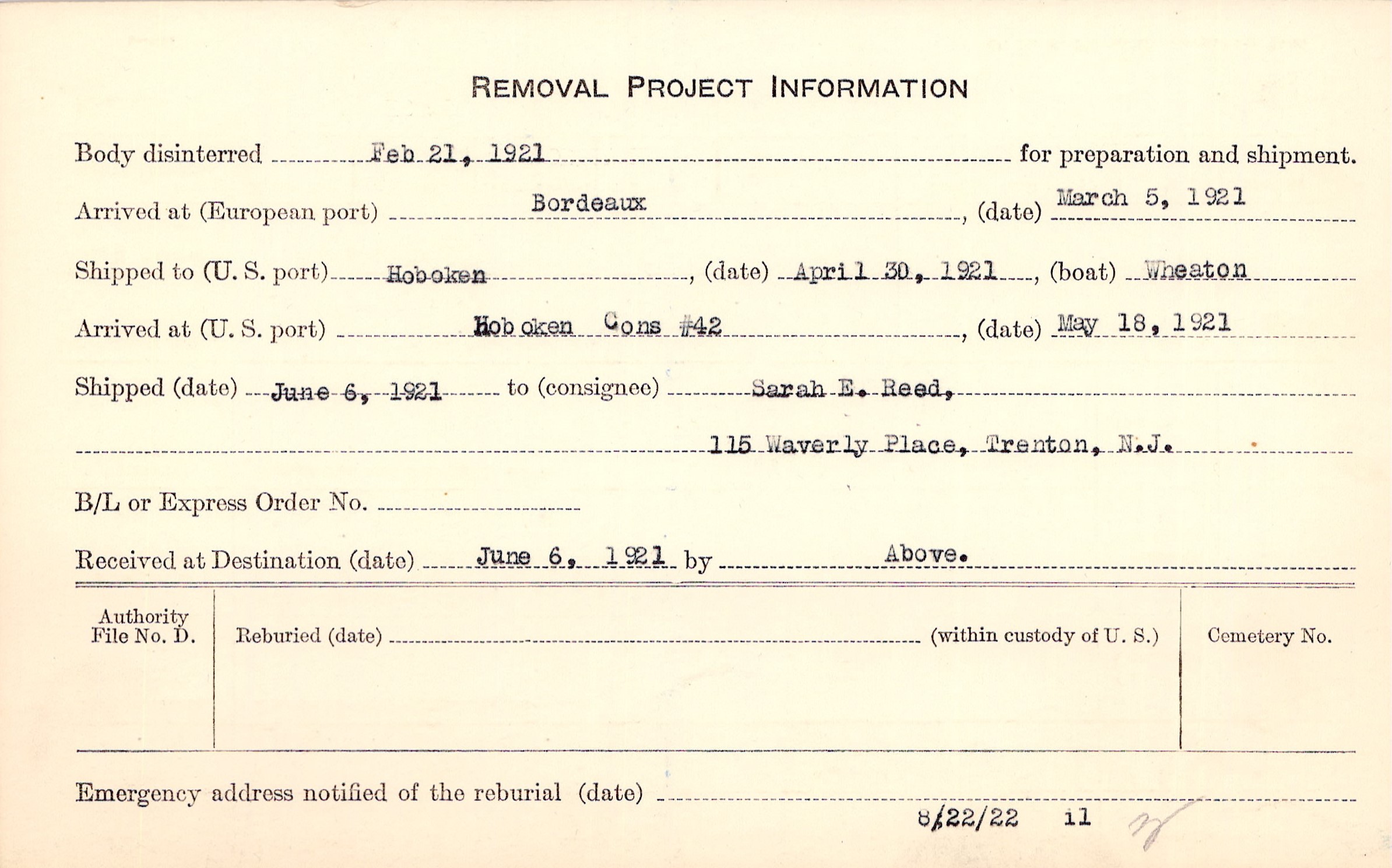 Body disinterred 2/21/1921 for preparation and shipment.