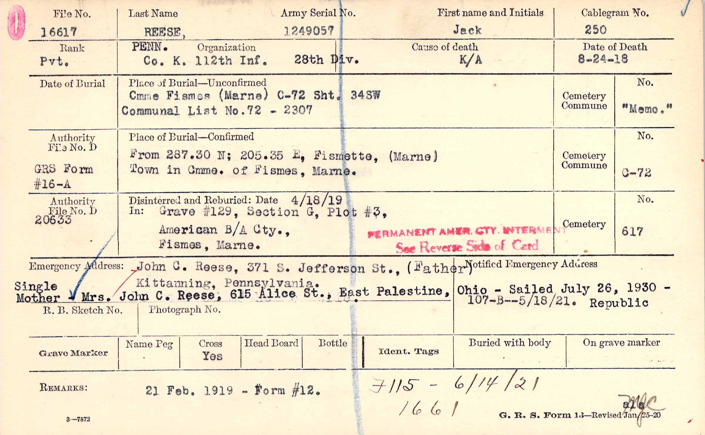 21 Feb. 1919 - Form #12., F115 - 6/14/21 1661