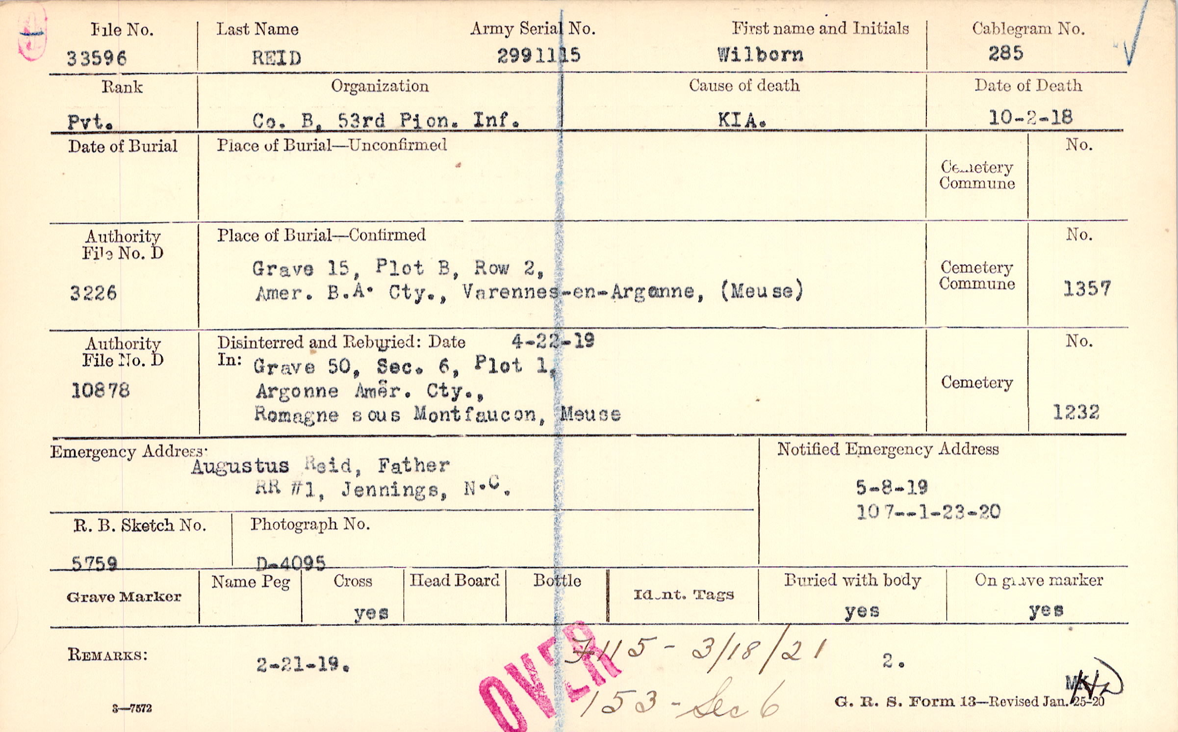 Grave 15, Plot B, Row 2, Amer. B/A Cty., Varennes-en-Argonne, Meuse.