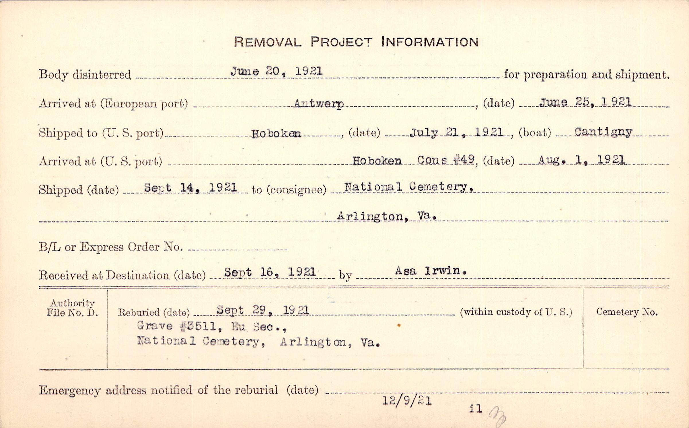 Body disinterred 6/20/1921 for preparation and shipment.