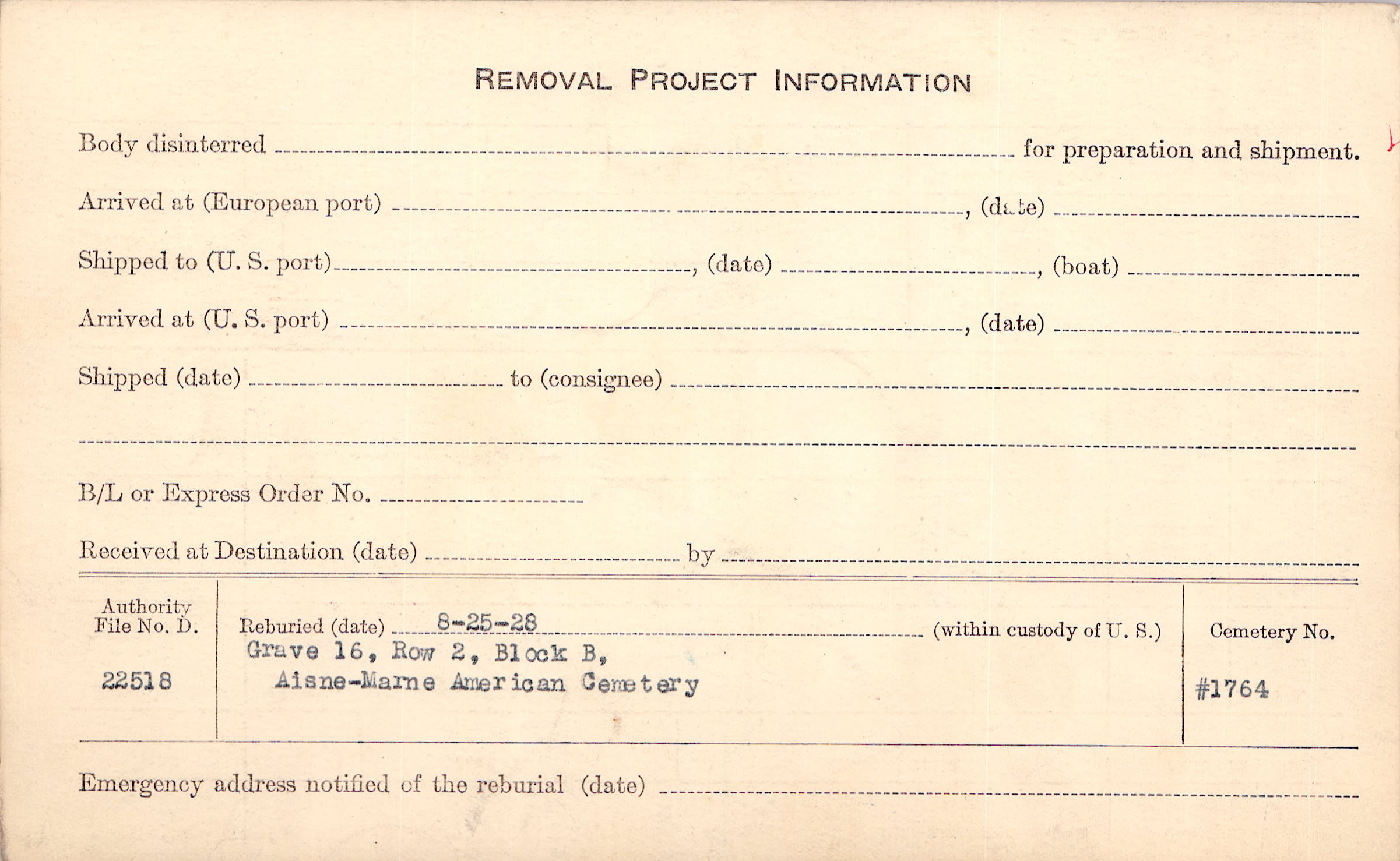 American Cemetery, Belleau, Aisne, Body held in Morgue