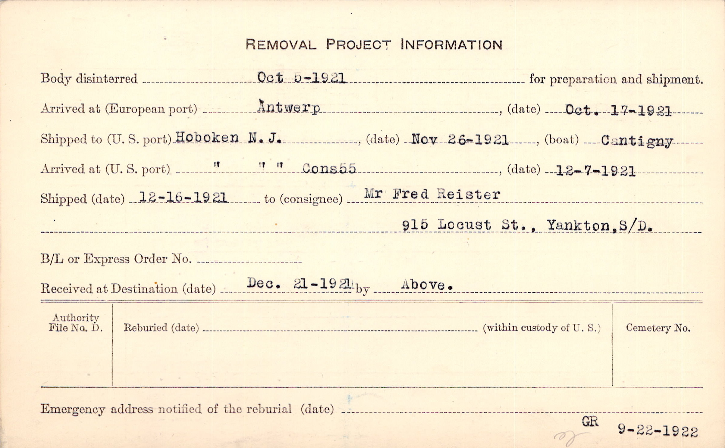 Body disinterred 10/5/1921 for preparation and shipment.