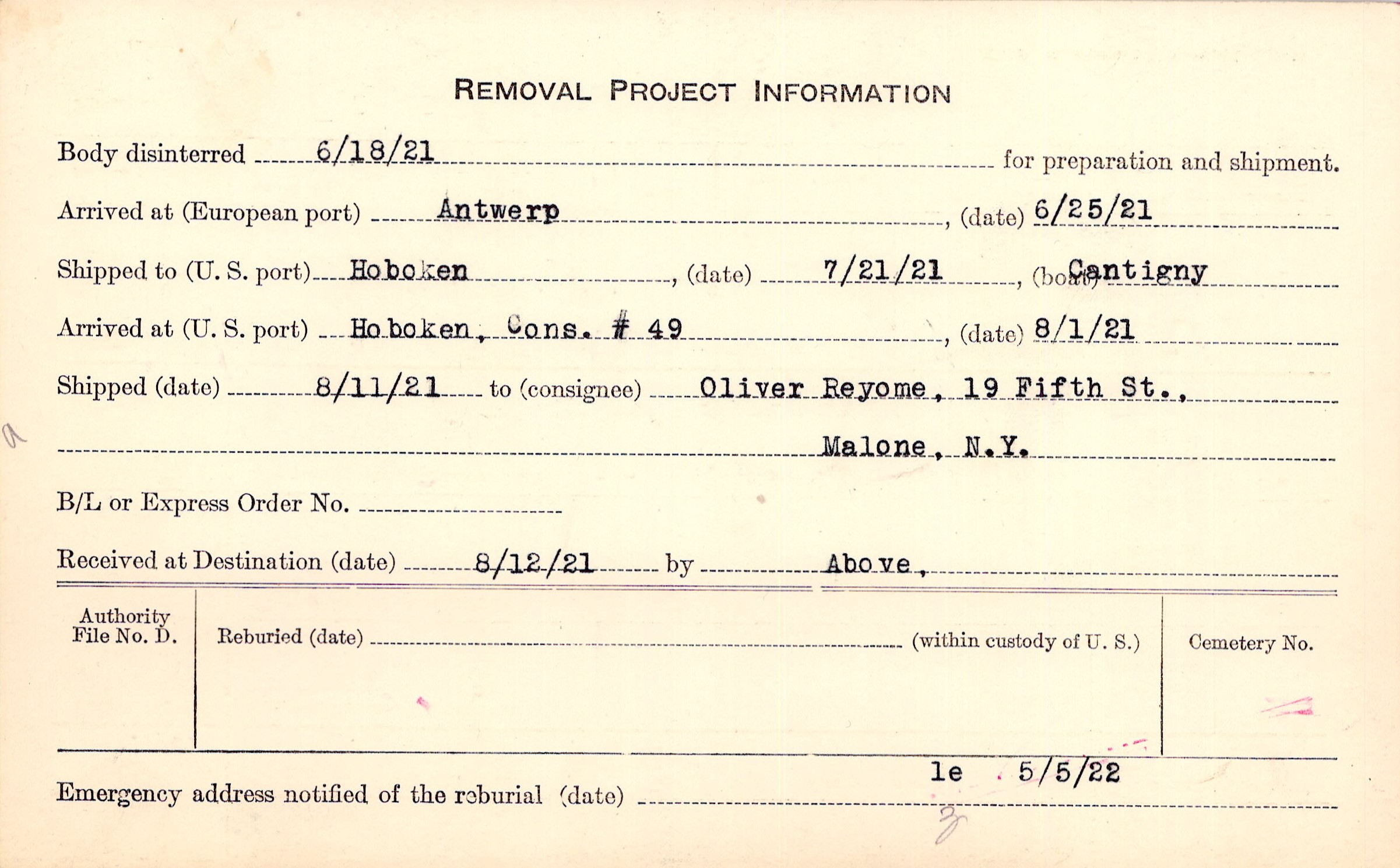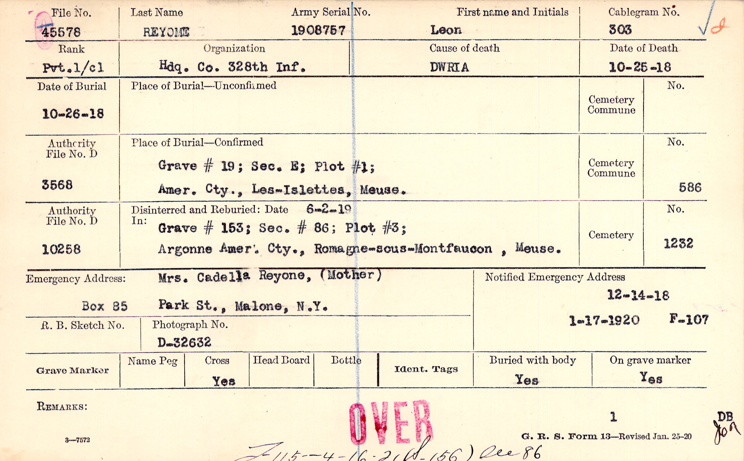 Mrs. Cadella Reyone, (Mother), Box 85 Park St., Malone, N.Y.