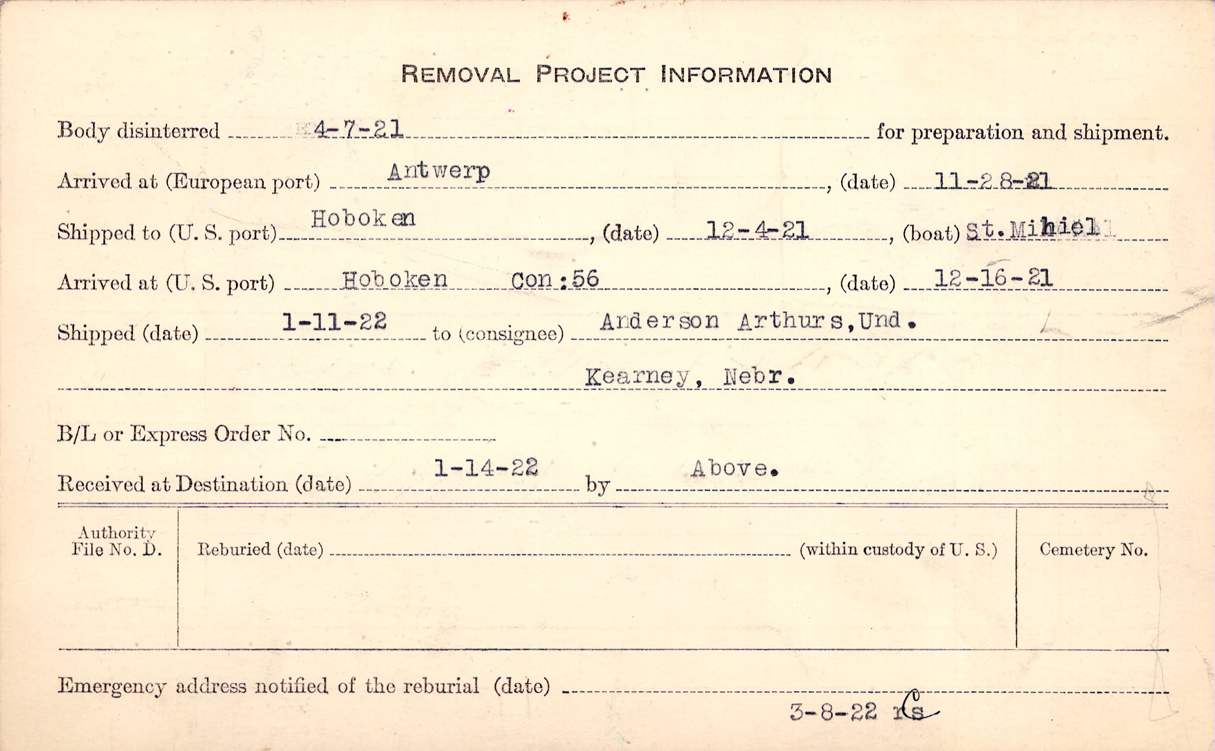 Body disinterred 4/7/1921 for preparation and shipment.