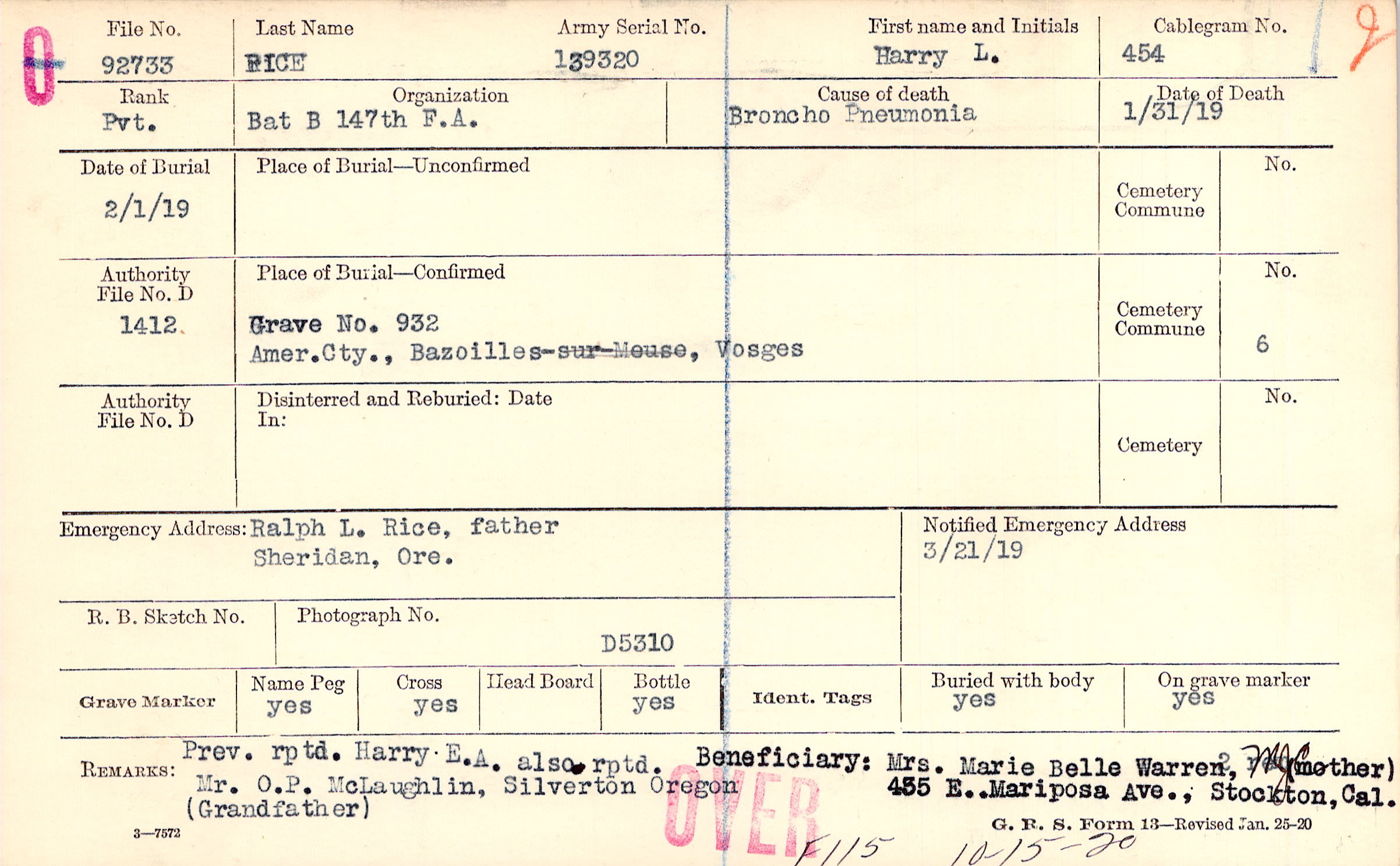 Prev. rptd. Harry E.A. also rptd. Mr. O.P. McLaughlin, Silverton, Oregon, (Grandfather) Beneficiary: Mrs. Marie Belle Warren, re(mother), 435 E..Mariposa Ave., Stockton, Cal., F115 10-15-20, F115 10-15-20