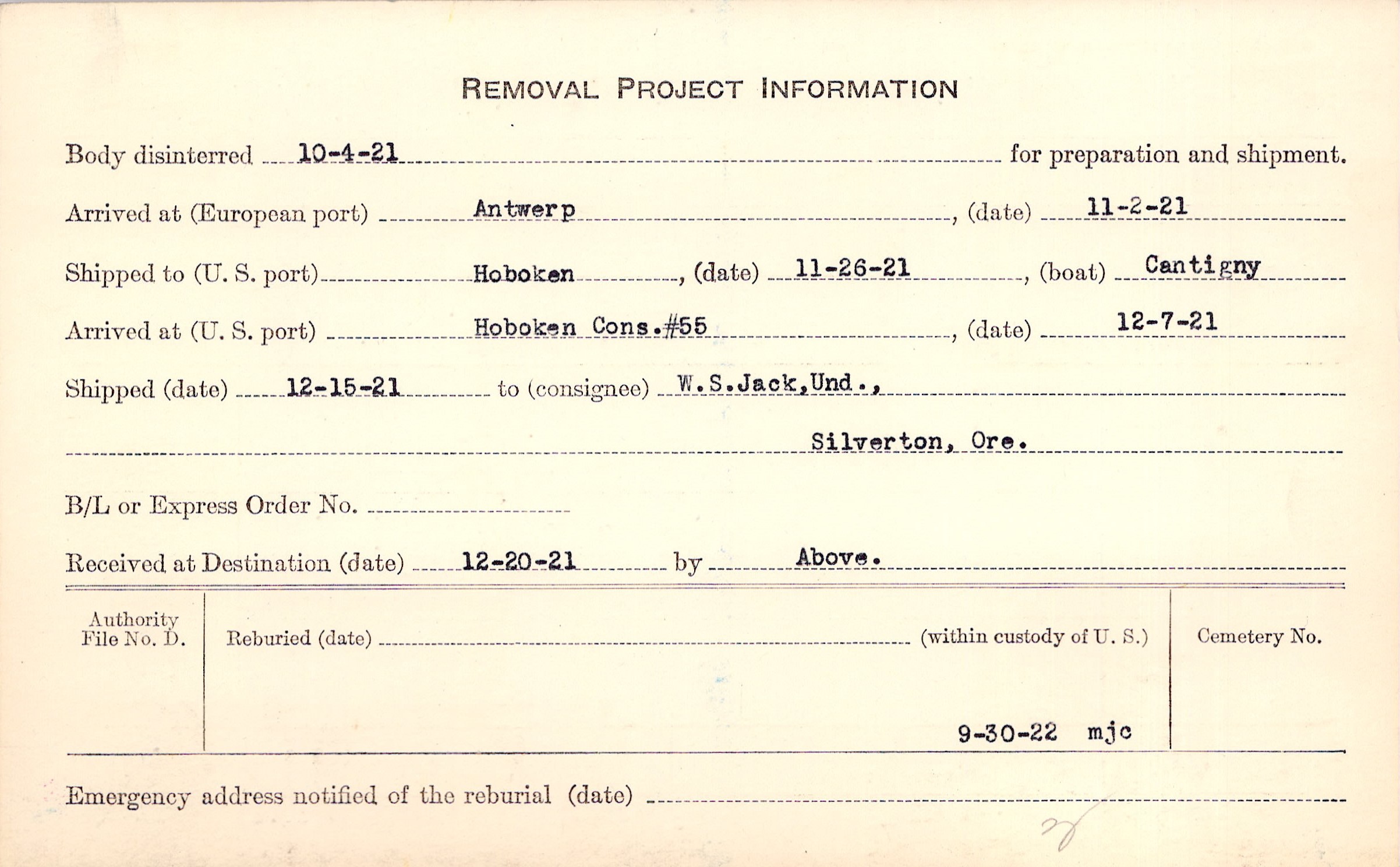 Body disinterred 10/4/1921 for preparation and shipment.
