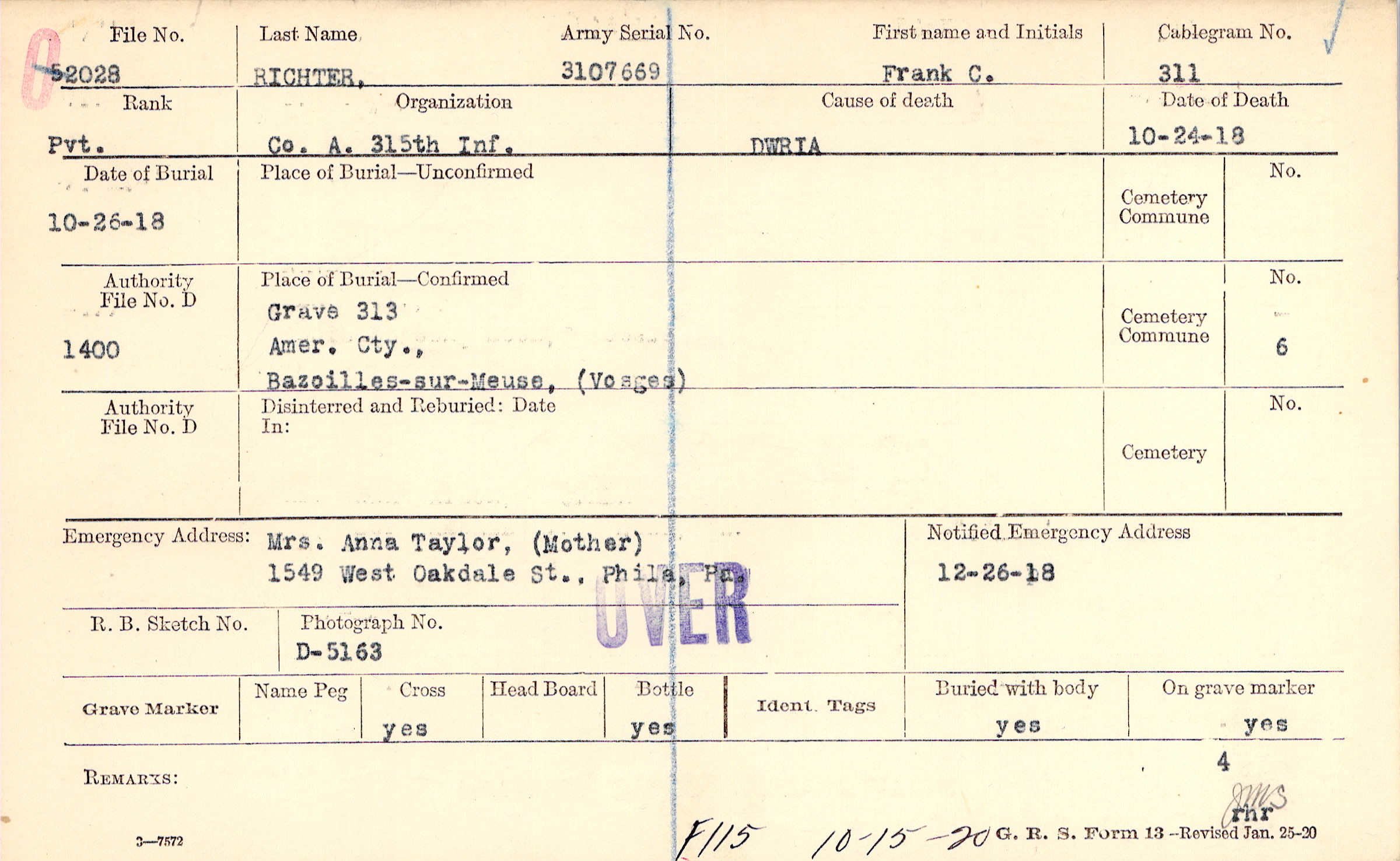Mrs. Anna Taylor, (Mother), 1549 West Oakdale St., Phila, Pa.