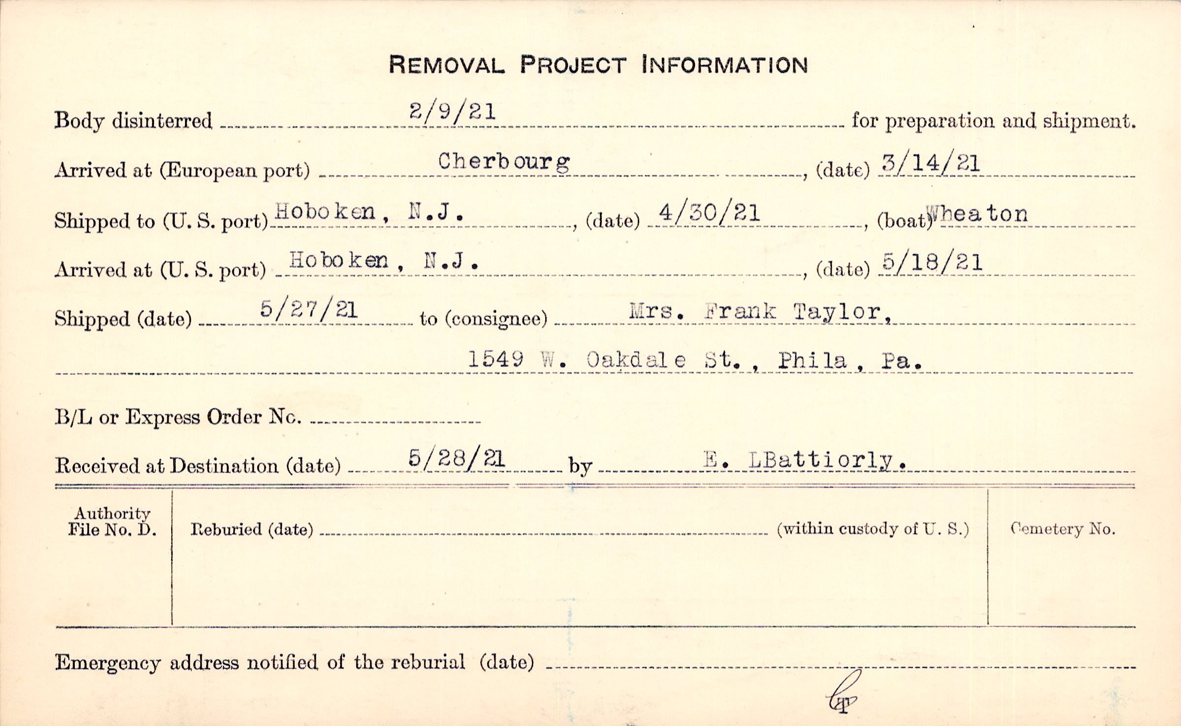 to Mrs. Frank Taylor, 1549 W. Oakdale St., Phila, Pa.