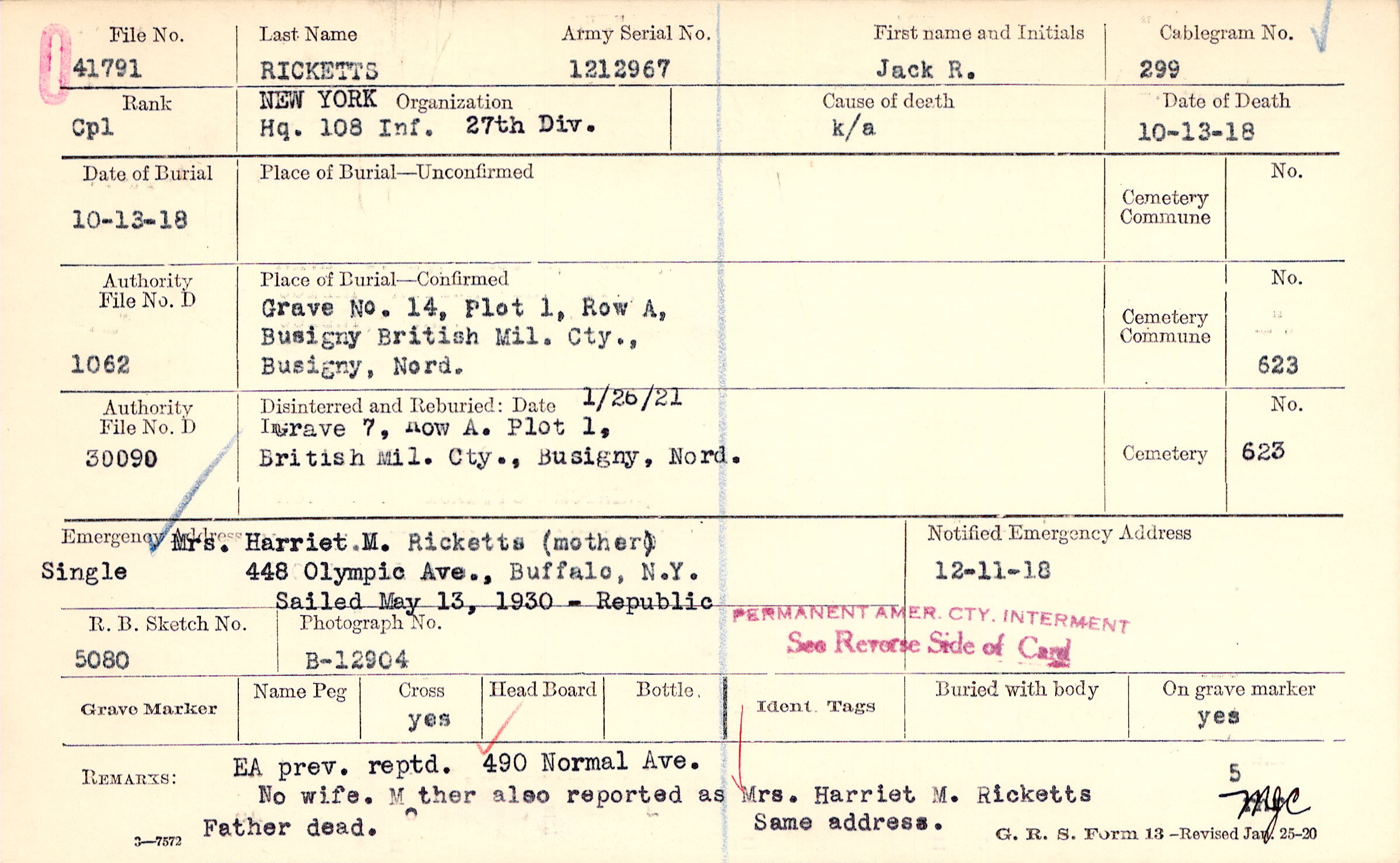 Mrs. Harriet. M. Ricketts (mother), 448 Olympic Ave., Buffalo, N.Y., Single Sailed May 13, 1930 - Republic