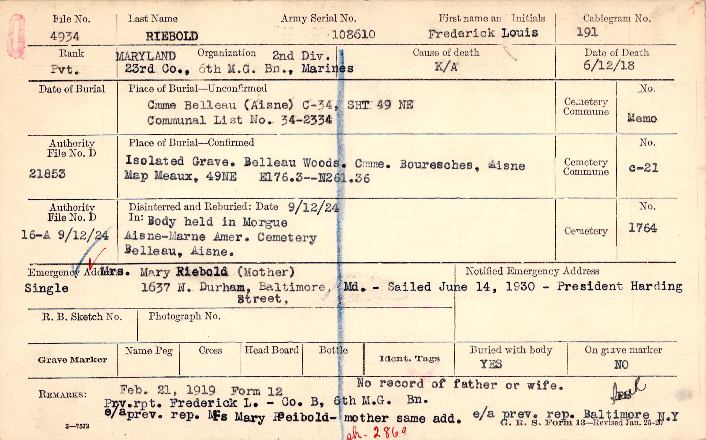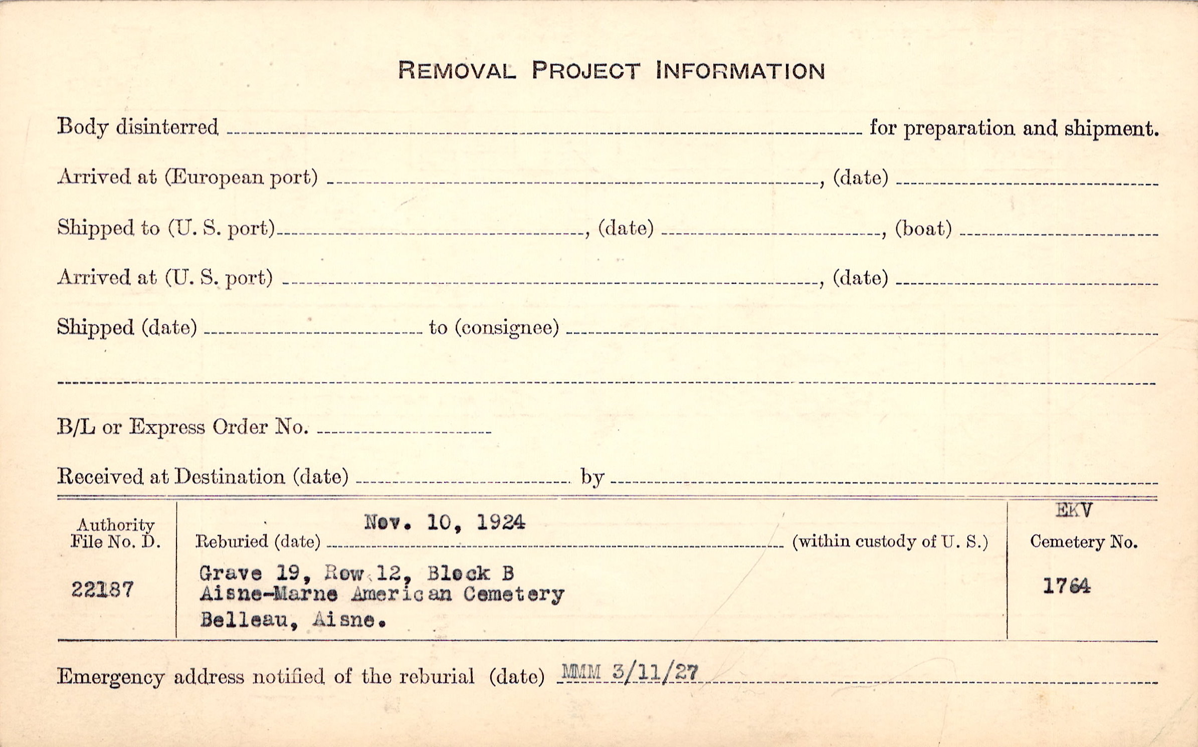 American Cemetery, Belleau, Aisne, Body held in Morgue