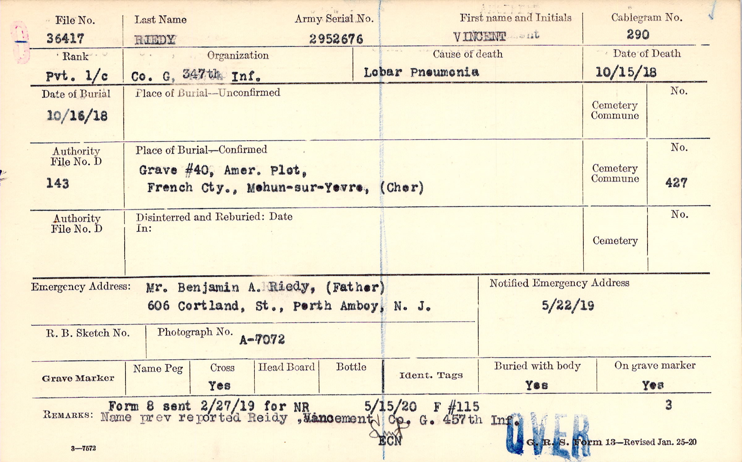Name prev reported Reidy, Vancement Co. G. 457th Inf., Form 8 sent 2/27/19 for NR, 5/15/20 F #115