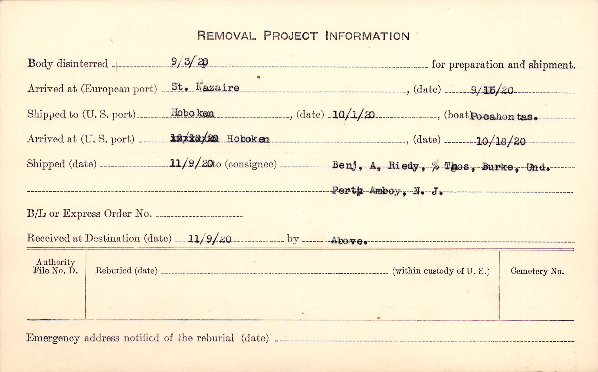 to Benj. A. Riedy, % Thos. Burke, Und., Perth Amboy, N. J.