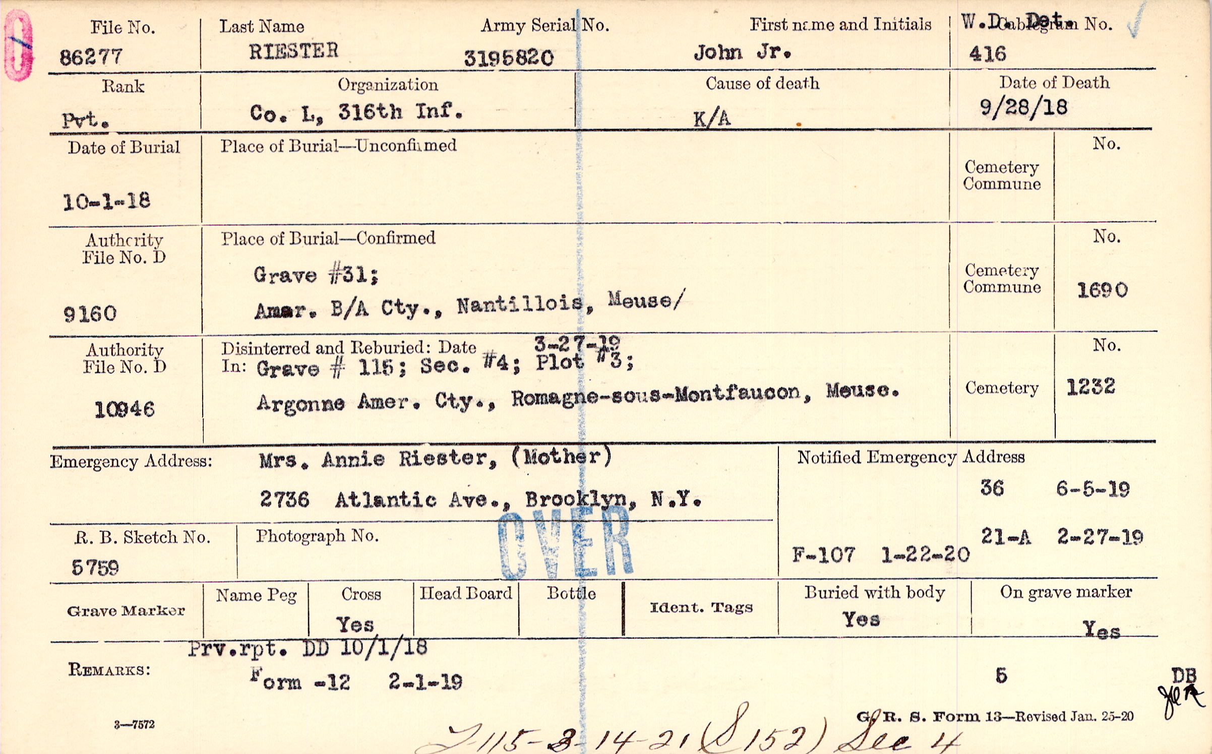 Mrs. Annie Riester, (Mother), 2736 Atlantic Ave., Brooklyn, N.Y.