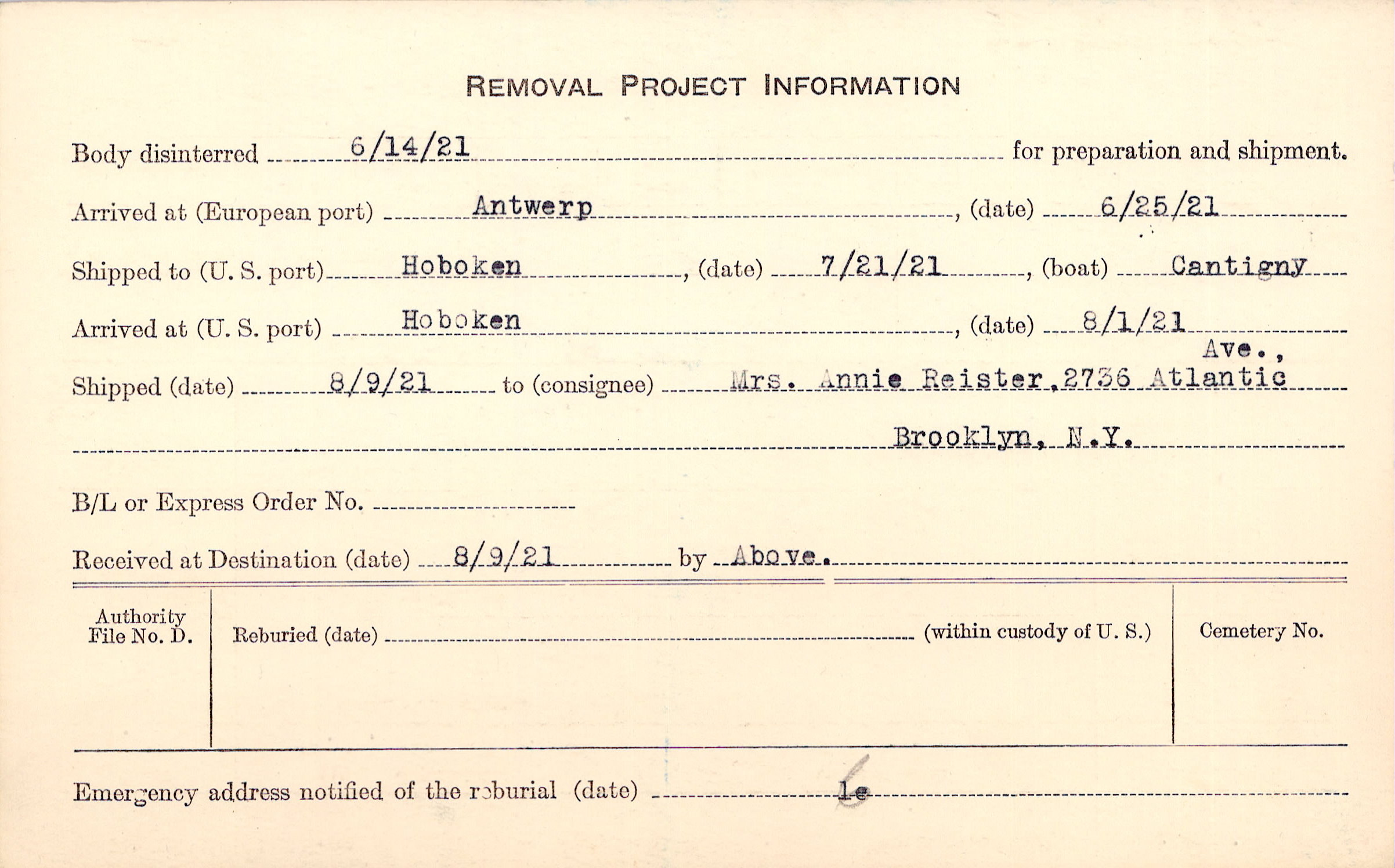 Body disinterred 6/14/1921 for preparation and shipment.
