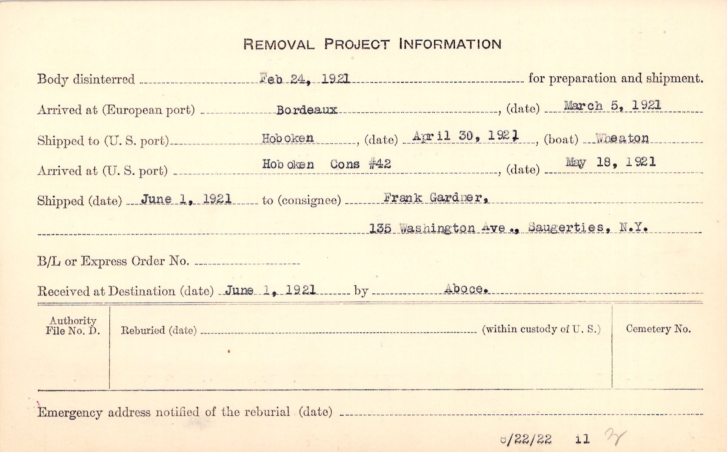 Body disinterred 2/24/1921 for preparation and shipment.