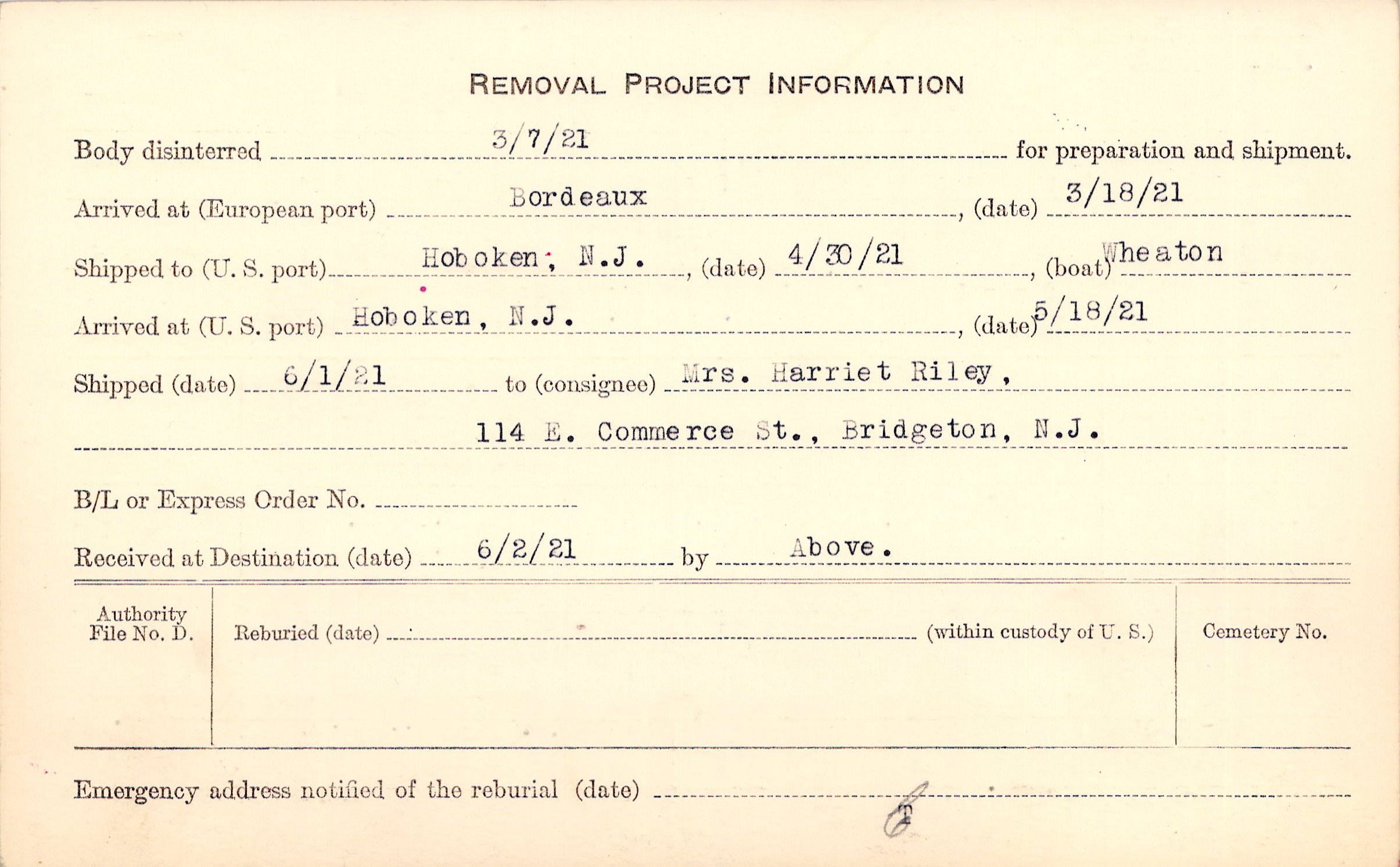 Mrs. Harriet Riley, Mother, Benef., 114 E. Commerce St., Bridgeton, N.J.