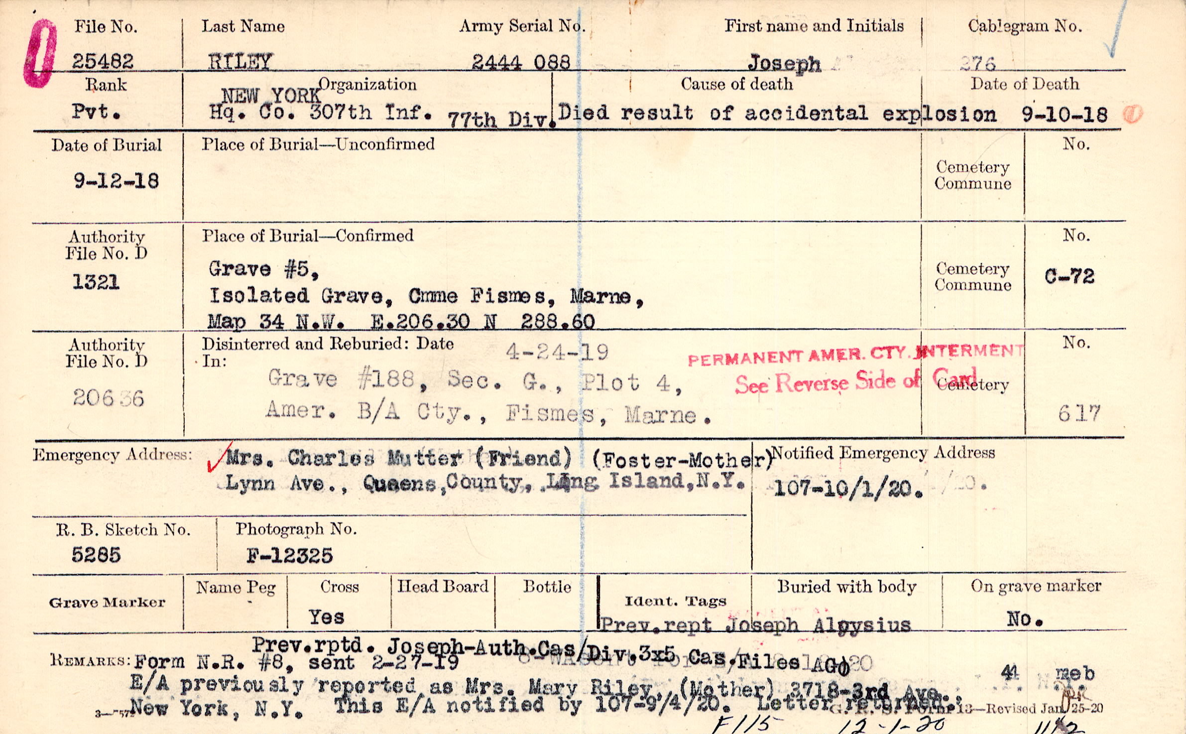 Prev. rptd. Joseph - Auth. Cas/Div. 3x5 Cas. Files AGO, E/A previously reported as Mrs. Mary Riley, (Mother) 3718-3rd Ave., New York, N.Y. This E/A notified by 107-9/4/20. Letter returned., Form N.R. #8, sent 2-27-19 8-WA sent for E/A 8-18-20 [over-typed], F115 12-1-20, 1142