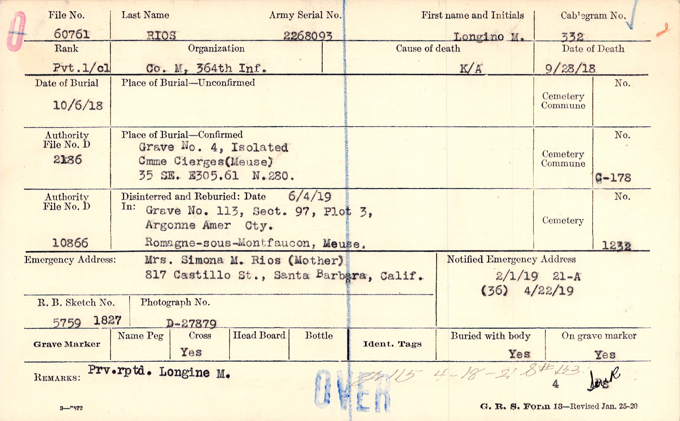 Mrs. Simona M. Rios (Mother), 817 Castillo St., Santa Barbara, Calif.