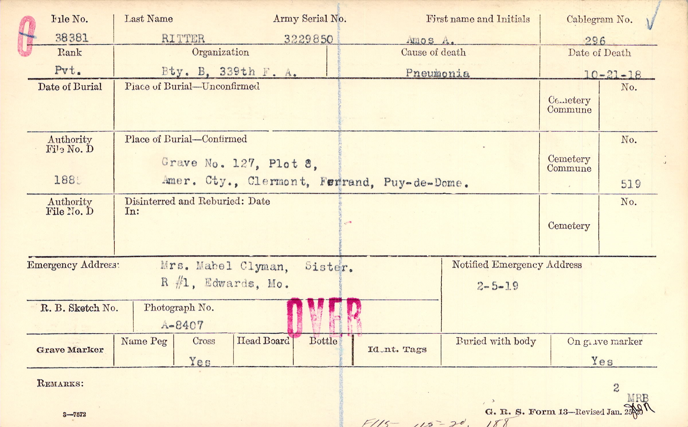 Grave 127, Plot 8, Amer. Cty., Clermont, Ferrand, Puy-de-Dome.