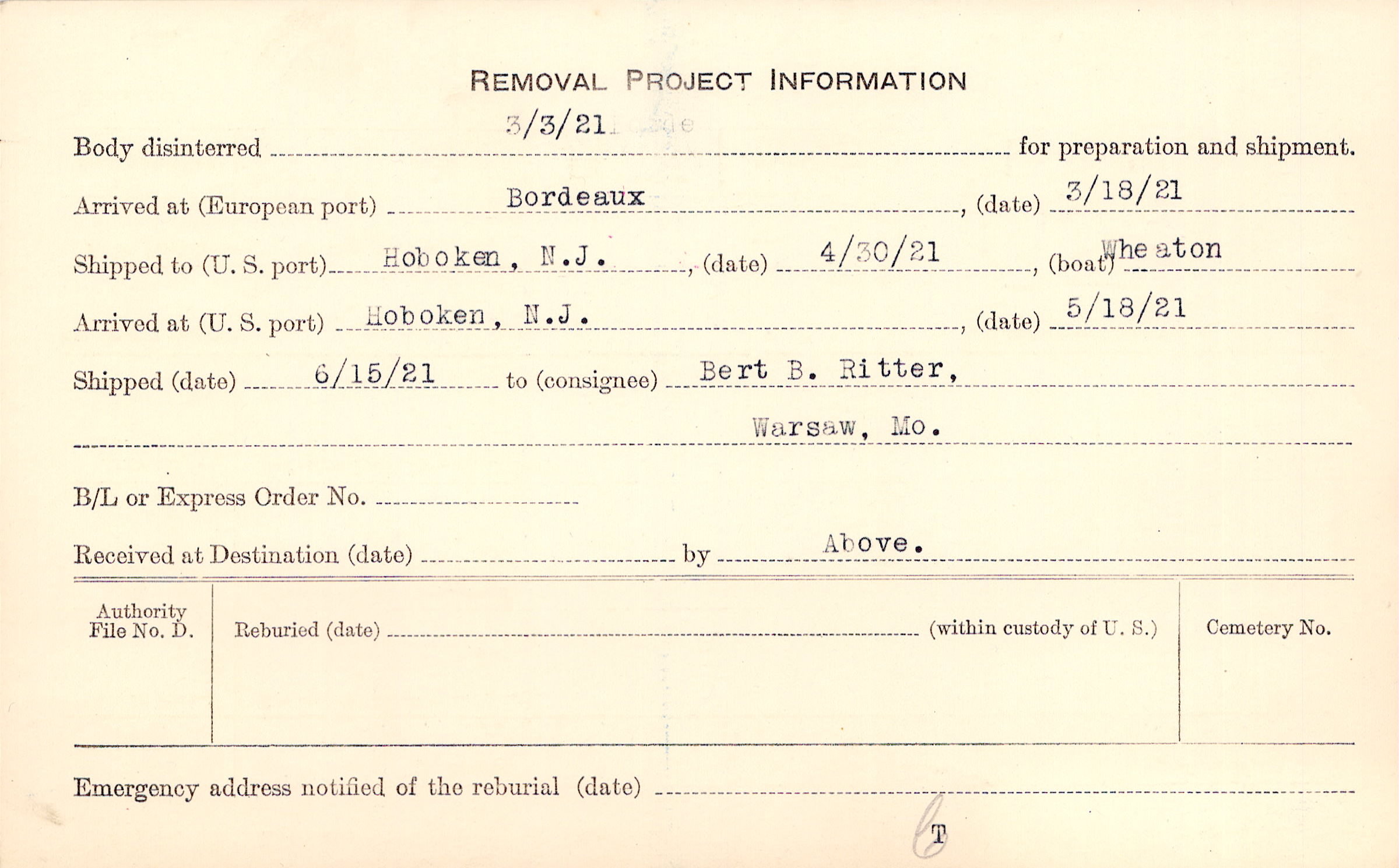 Body disinterred 3/3/1921 for preparation and shipment.