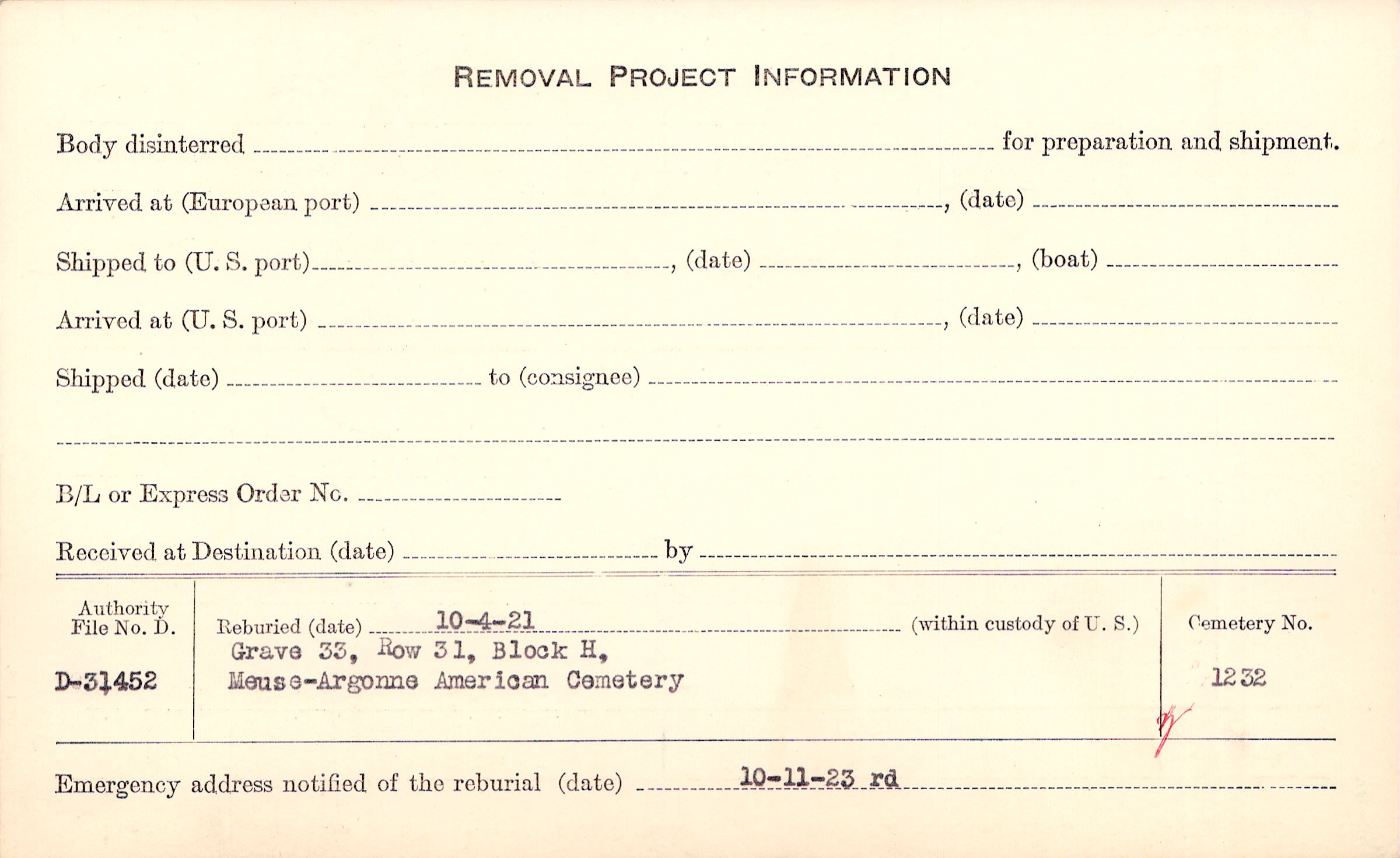 | Permanent Burial in Foreign Cemetery |