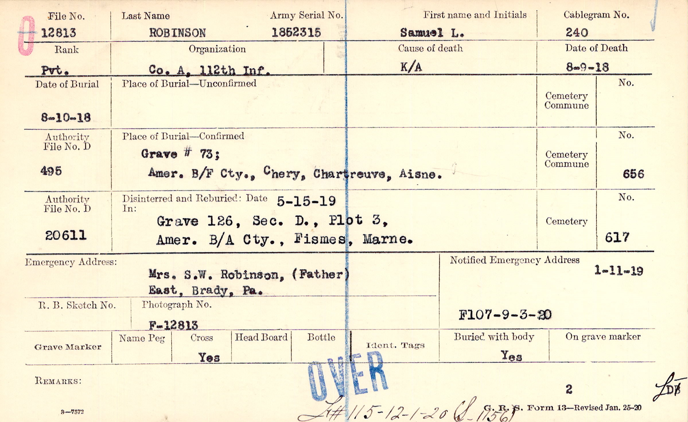 Grave 126, Section D, Plot 3, American B/A Cemetery, Fismes, Marne