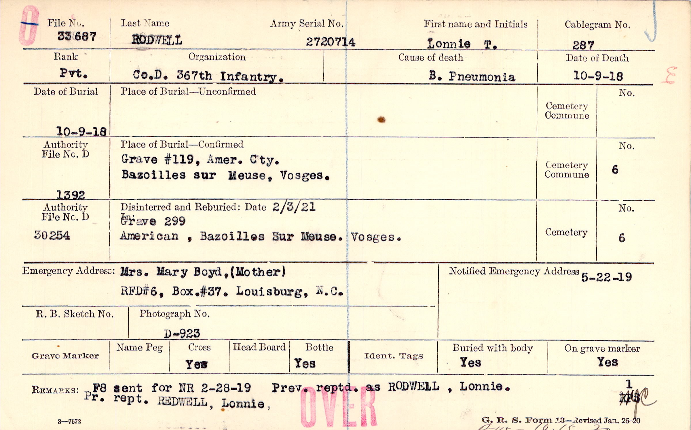 Mrs. Mary Boyd,(Mother), RFD#6, Box.#37. Louisburg, N.C.