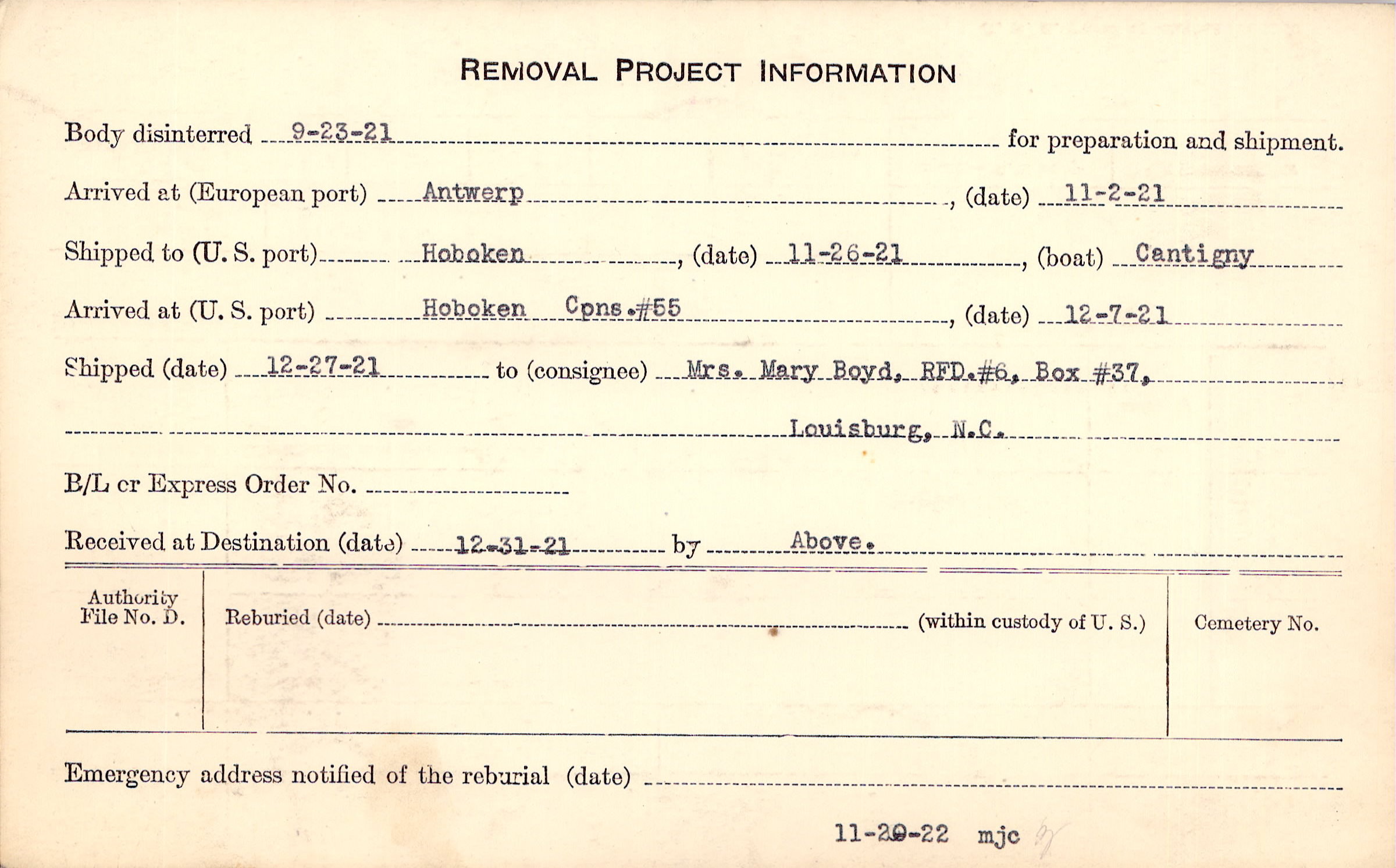 Body disinterred 9/23/1921 for preparation and shipment.