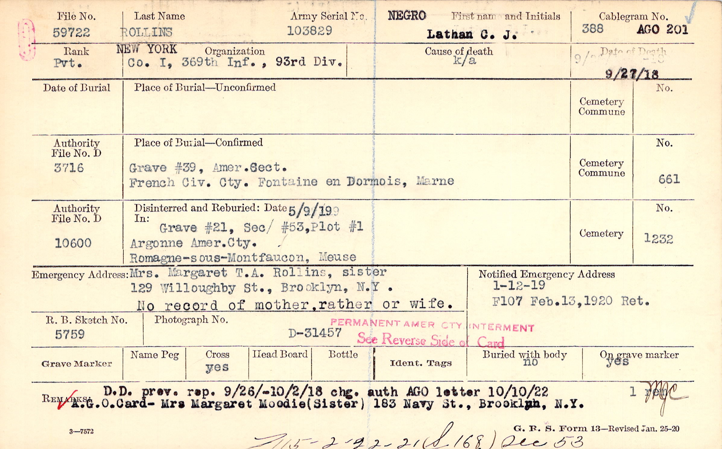 Mrs. Margaret T.A. Rollins, sister, 129 Willoughby St., Brooklyn, N.Y., No record of mother, rather, or wife