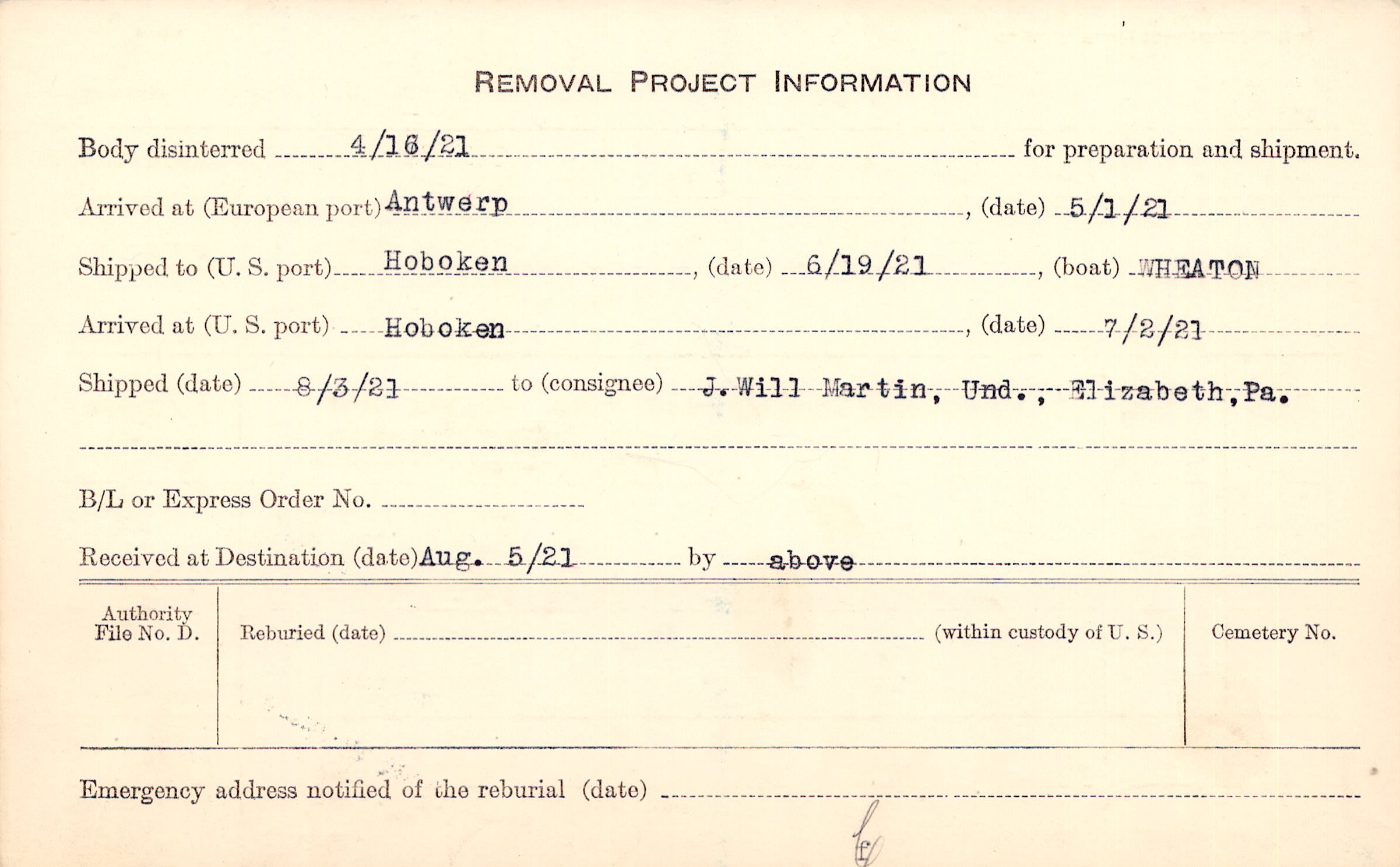 Body disinterred 4/16/1921 for preparation and shipment.