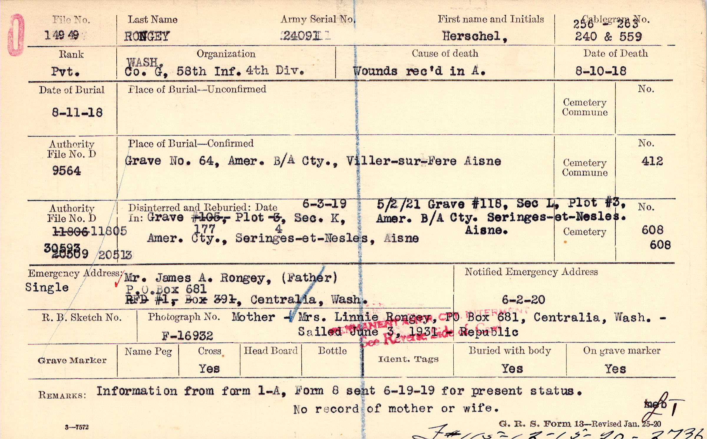 Mr. James A. Rongey, (Father), P.O. Box 681, Centralia, Wash., Single Mother - Mrs. Linnie Rongey, PO Box 681, Centralia, Wash. - Sailed June 3, 1931 - Republic