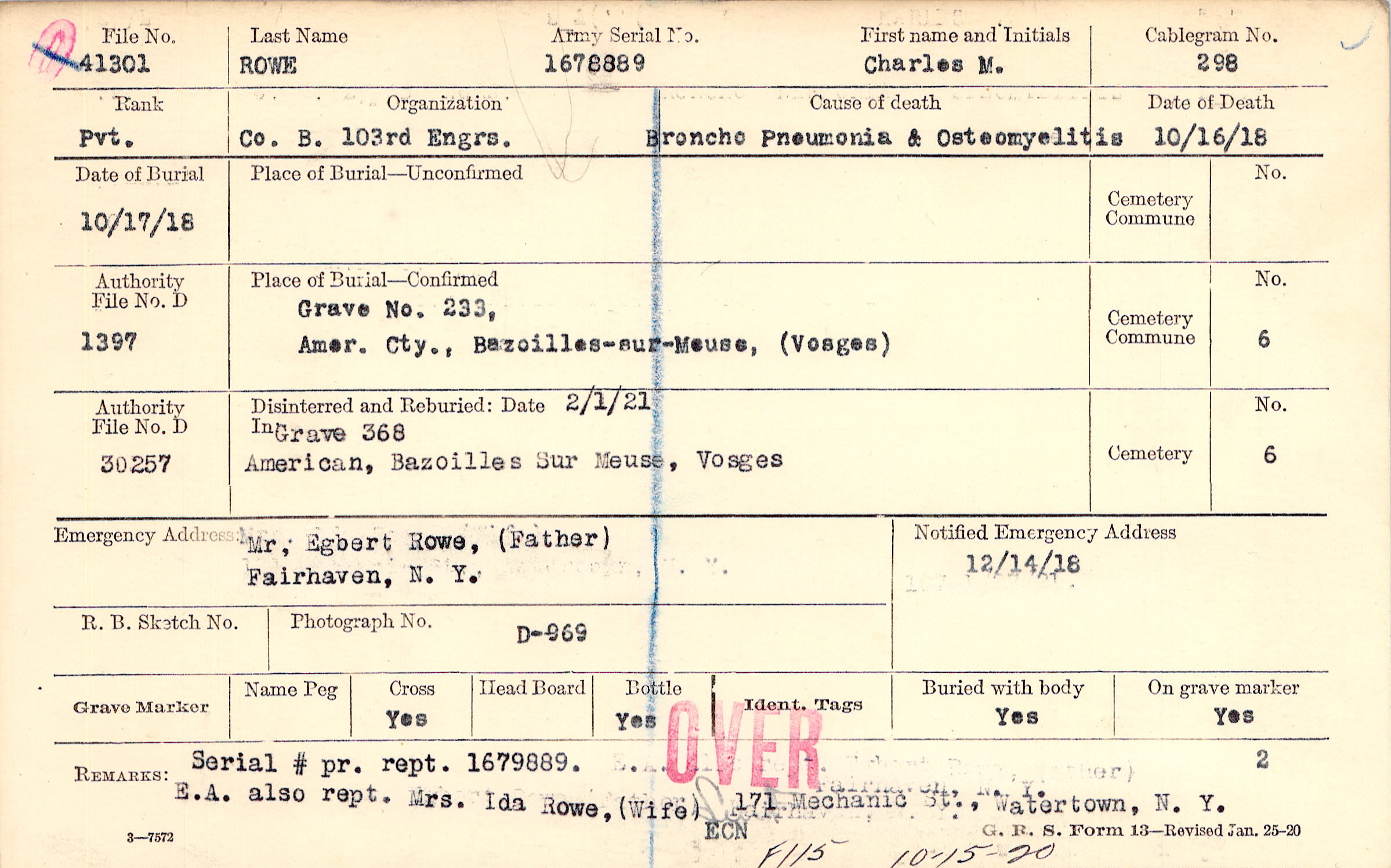 Serial # pr. rept. 1679889 E.A. also rept. Mrs. Ida Rowe, (Wife) 171 Mechanic St., Watertown, N. Y., F115 10-15-20