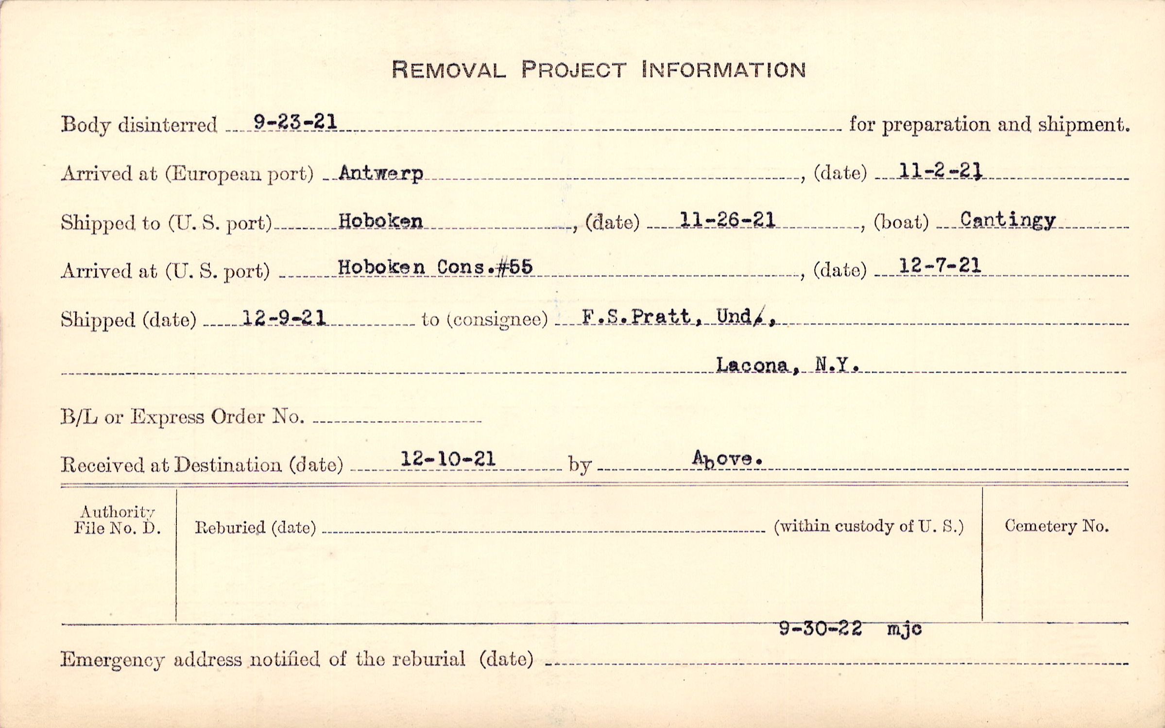 Body disinterred 9/23/1921 for preparation and shipment.
