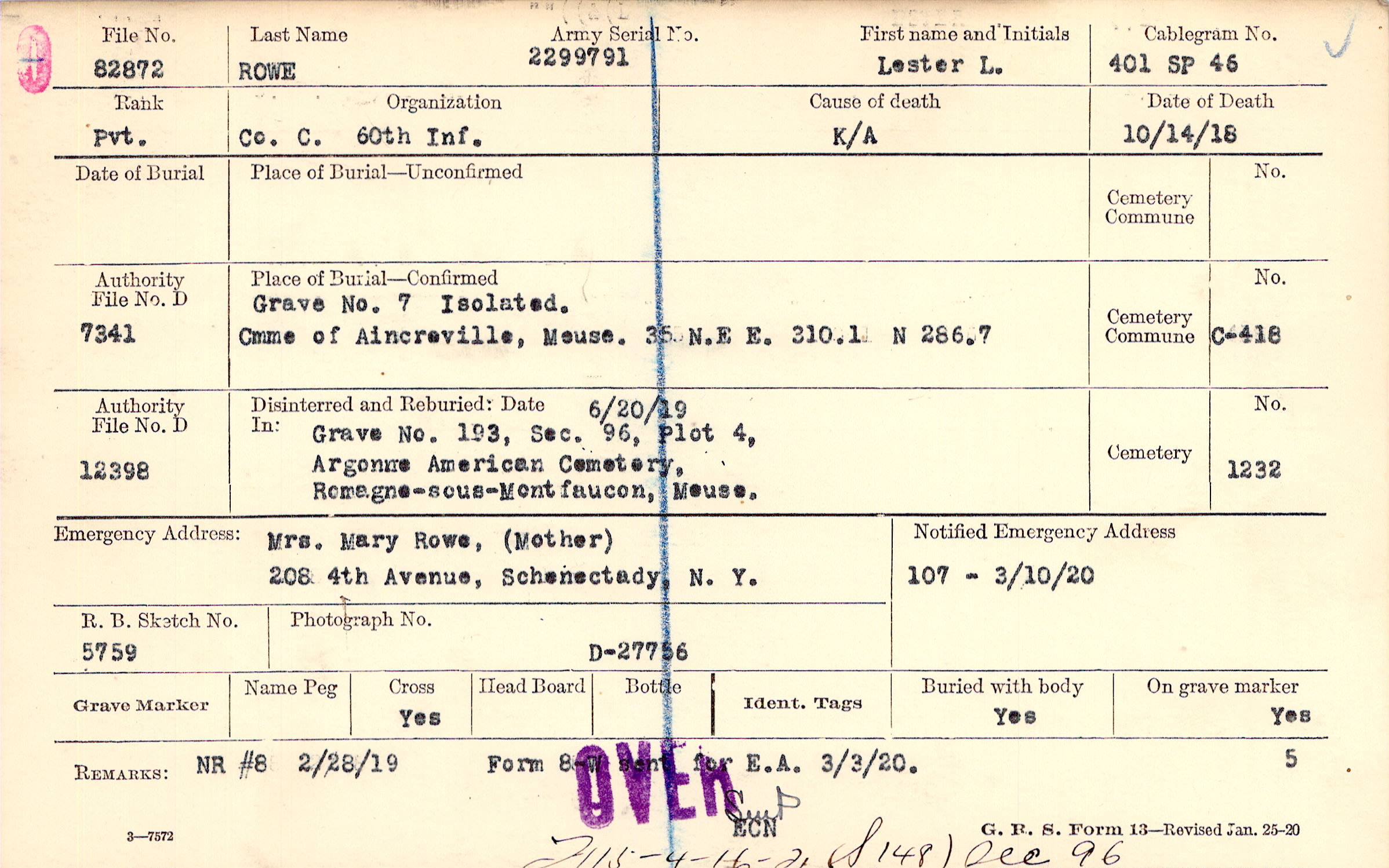 Mrs. Mary Rowe, (Mother), 208 4th Avenue, Schenectady, N.Y.