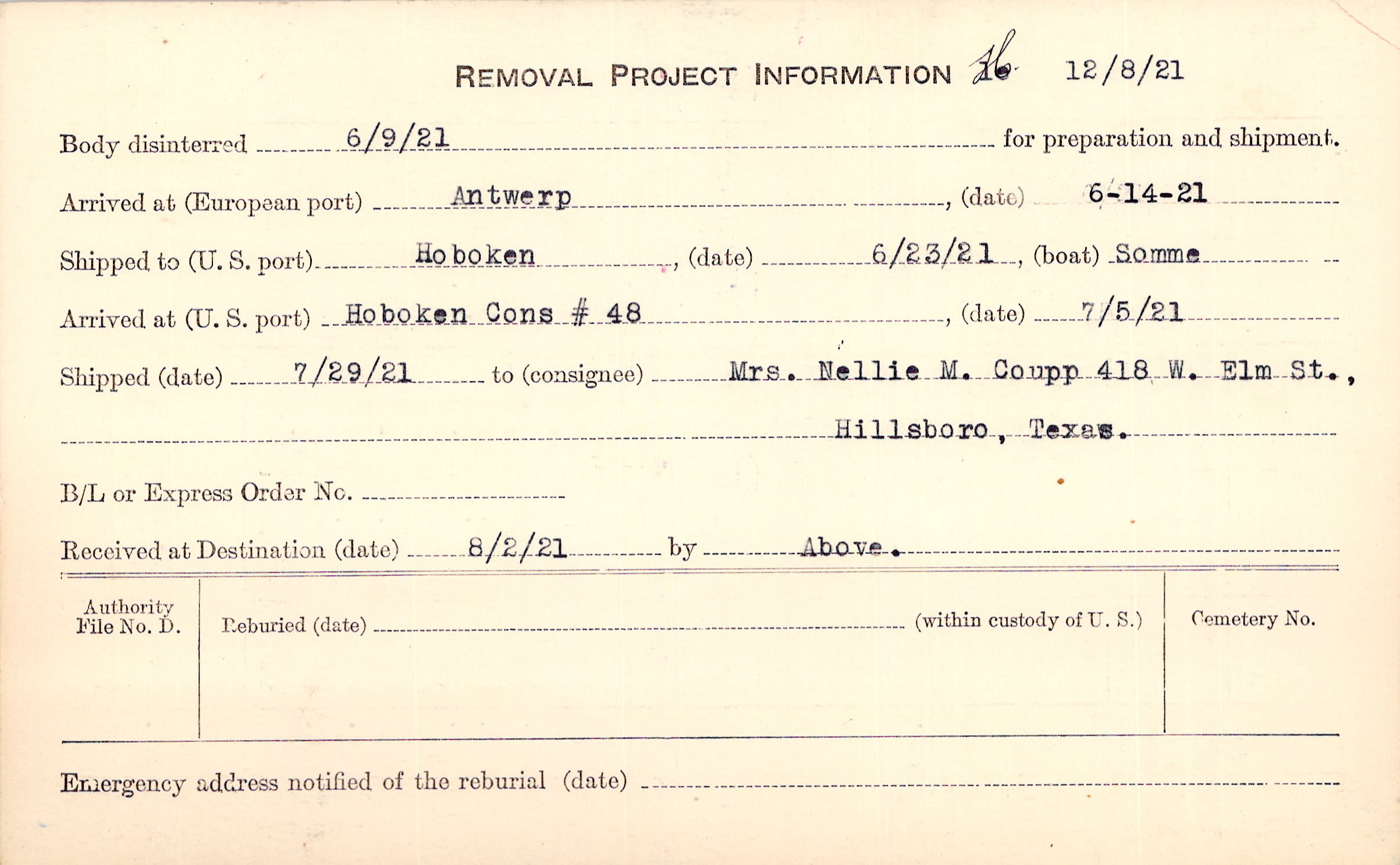 Body disinterred 6/9/1921 for preparation and shipment.