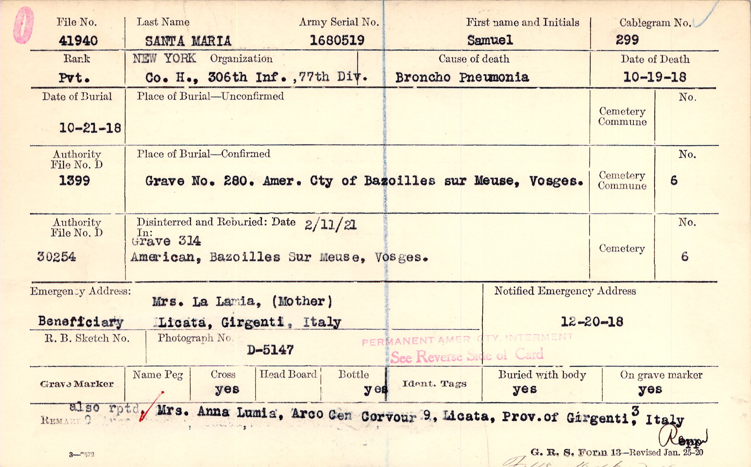 also rptd. Mrs. Anna Lumia, Arco Cen Corvour 9, Licata, Prov. of Girgenti, Italy