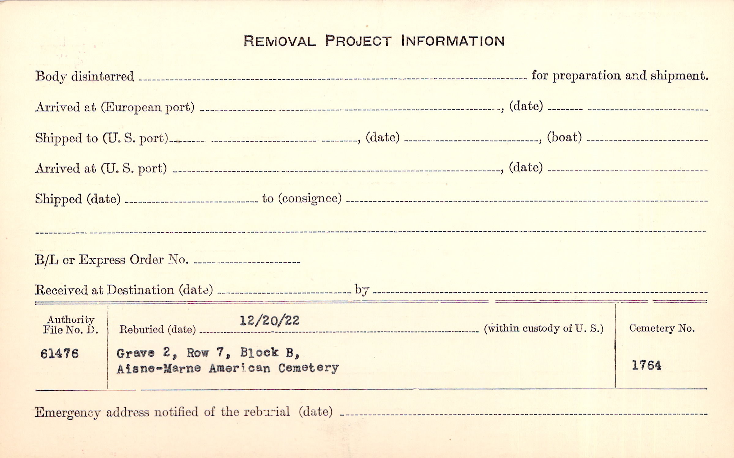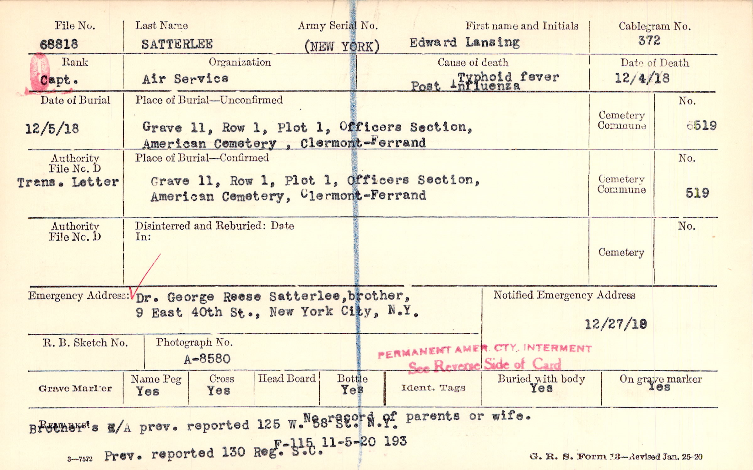 Grave 11, Row 1, Plot 1, Officers Section, American Cemetery, Clermont-Ferrand.