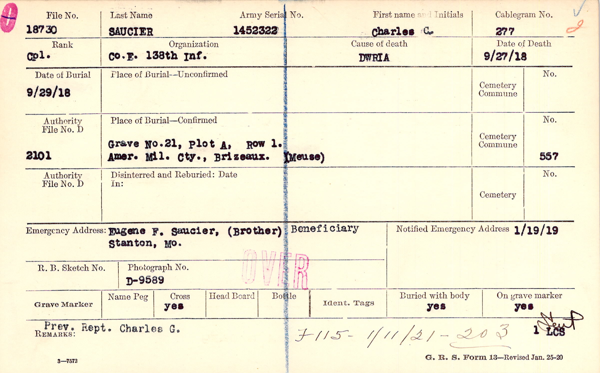 Grave 21, Plot A, Row 1, Amer. Mil. Cty., Brizeaux. (Meuse)
