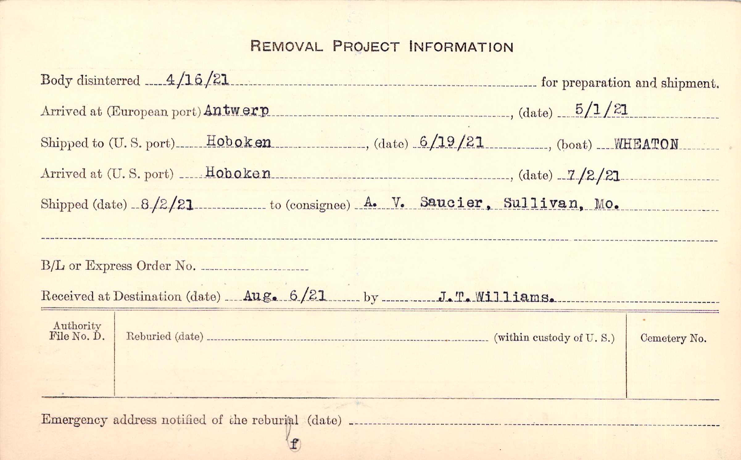 Body disinterred 4/16/1921 for preparation and shipment.