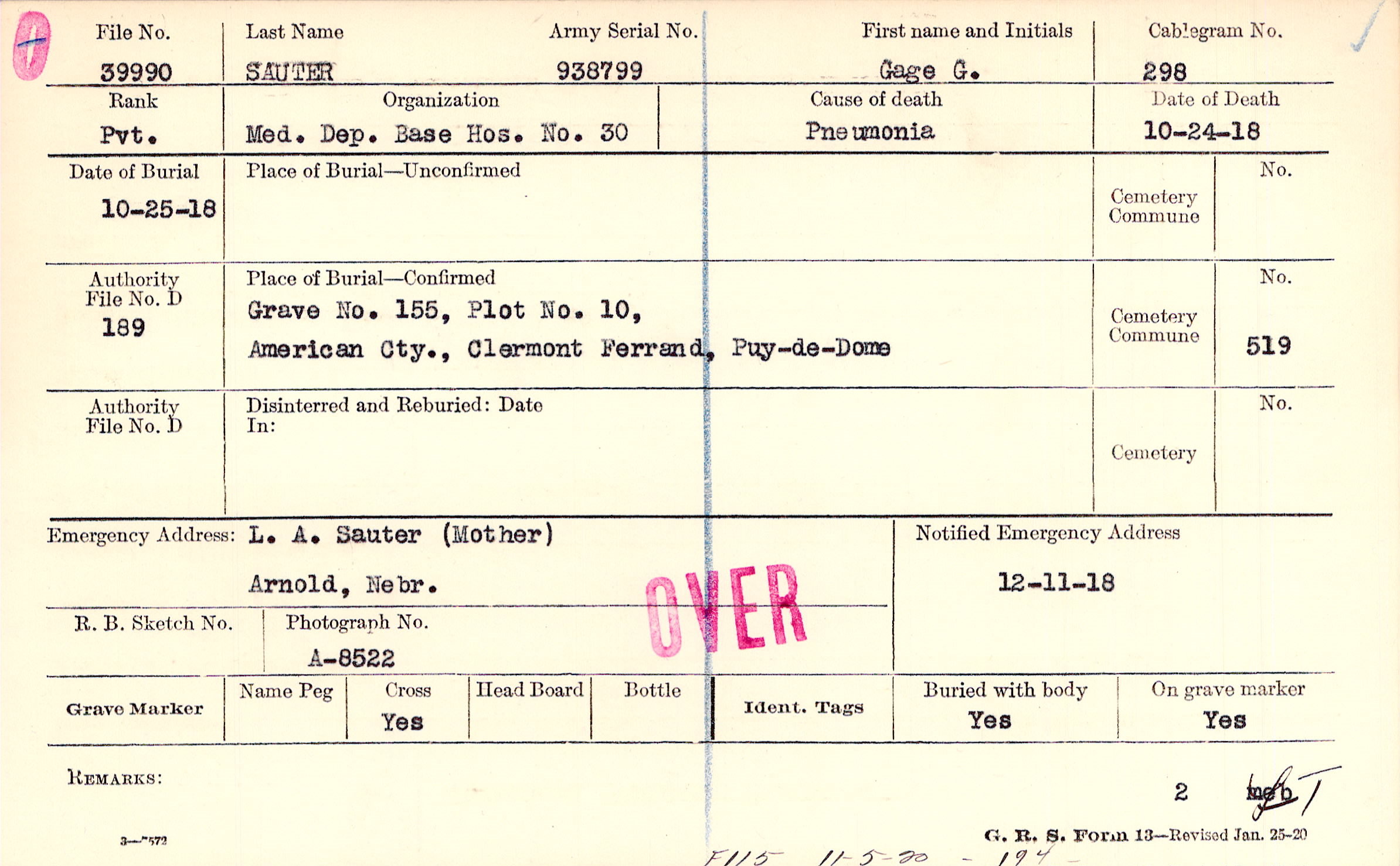 Grave 155, Plot 10, American Cty., Clermont Ferrand, Puy-de-Dome