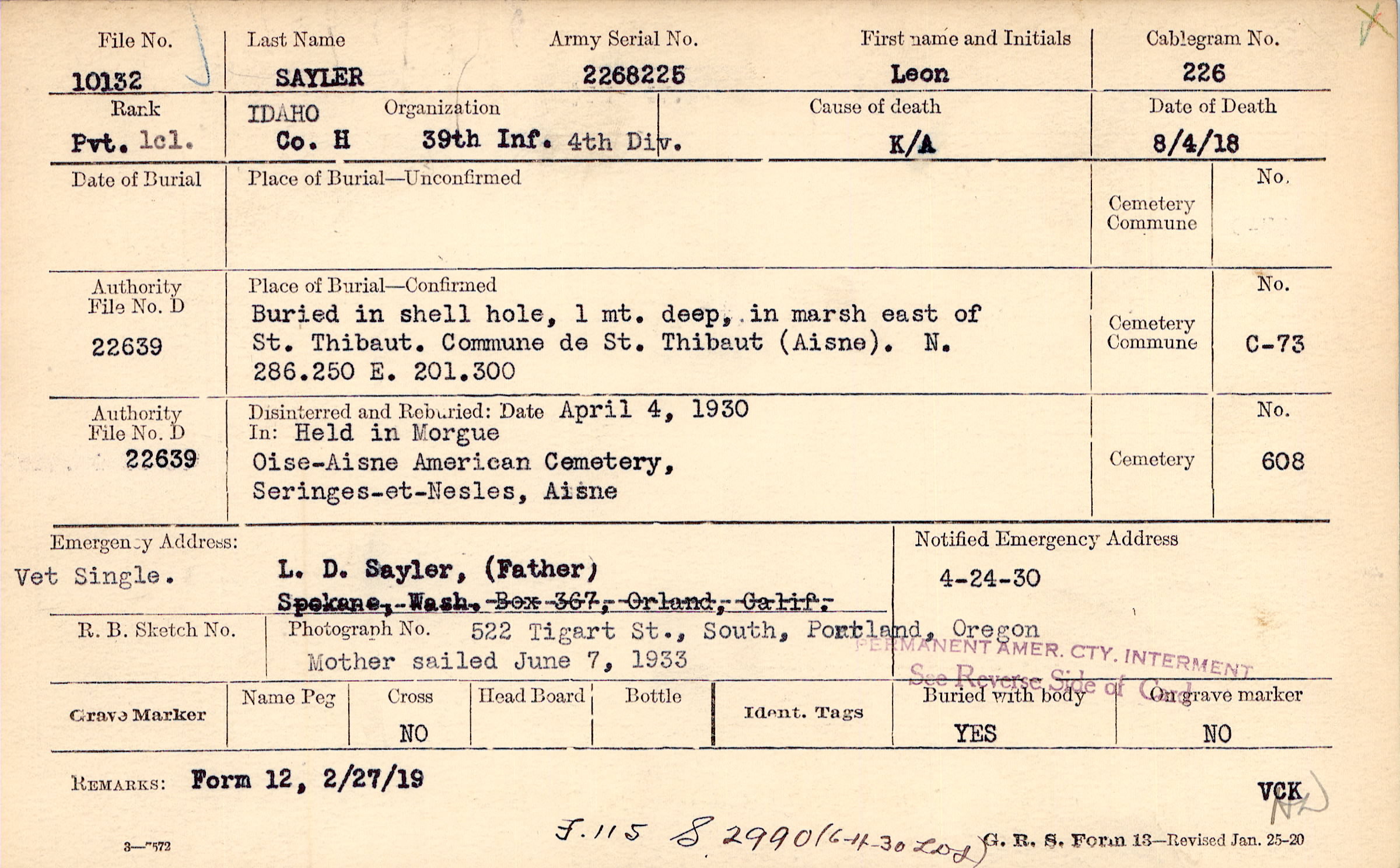 L.D. Sayler, (Father), 522 Tigart St., South, Portland, Oregon, Vet Single. Mother sailed June 7, 1933