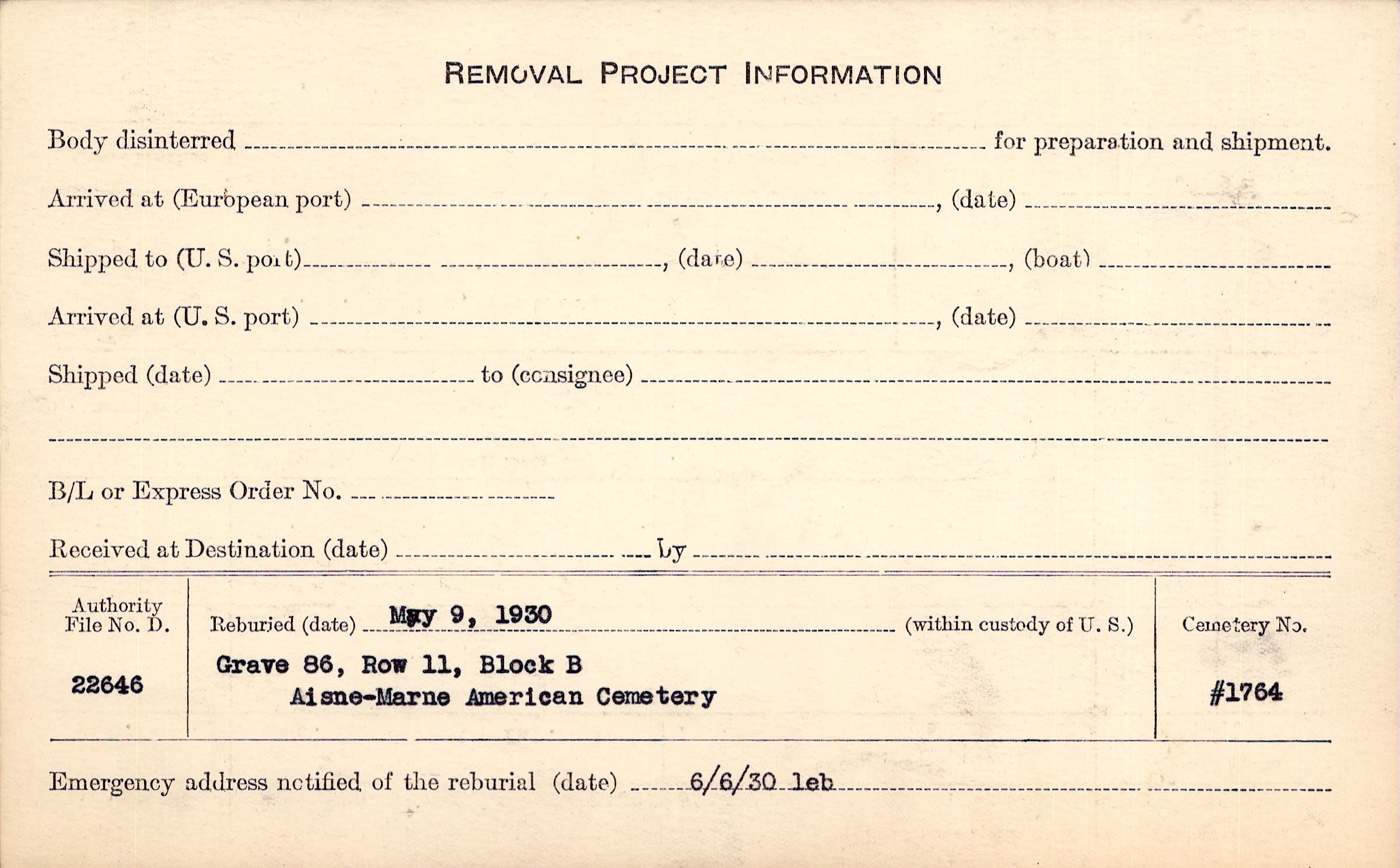 American B/A Cemetery, Seringes-et-Nesles, Aisne, Held in Morgue Oise-Aisne American Cemetery, Seringes-et-Nesles, Aisne